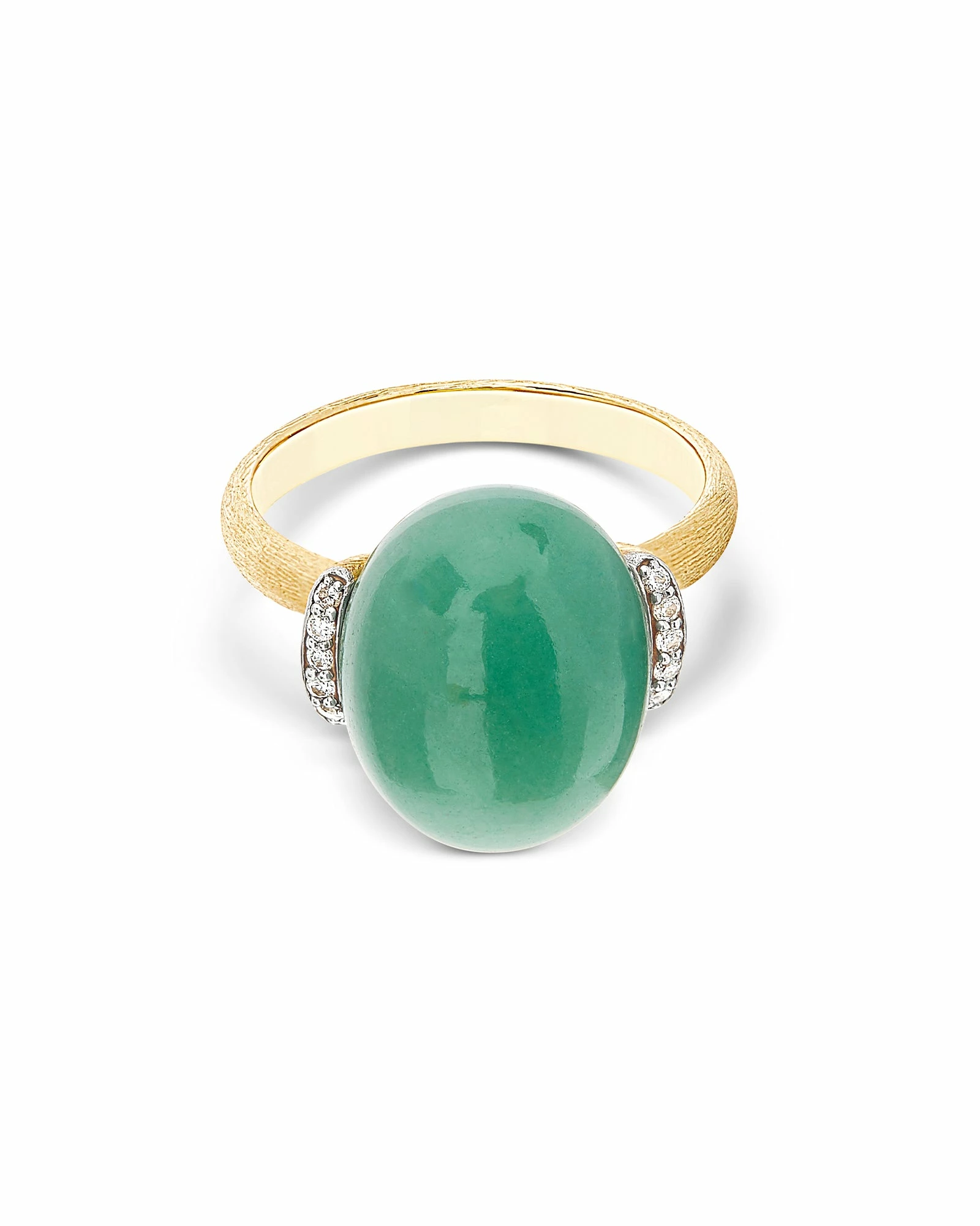 The mysterious green aventurine meets the 18kt gold and the diamonds in this ring of the Terre Lontane collection, inspired by the extraordinary Amazon, green lung of the Earth and home of the biggest biodiversity of the world. A jewel with a timeless charm, conceived as a precious talisman to always carry with you.
