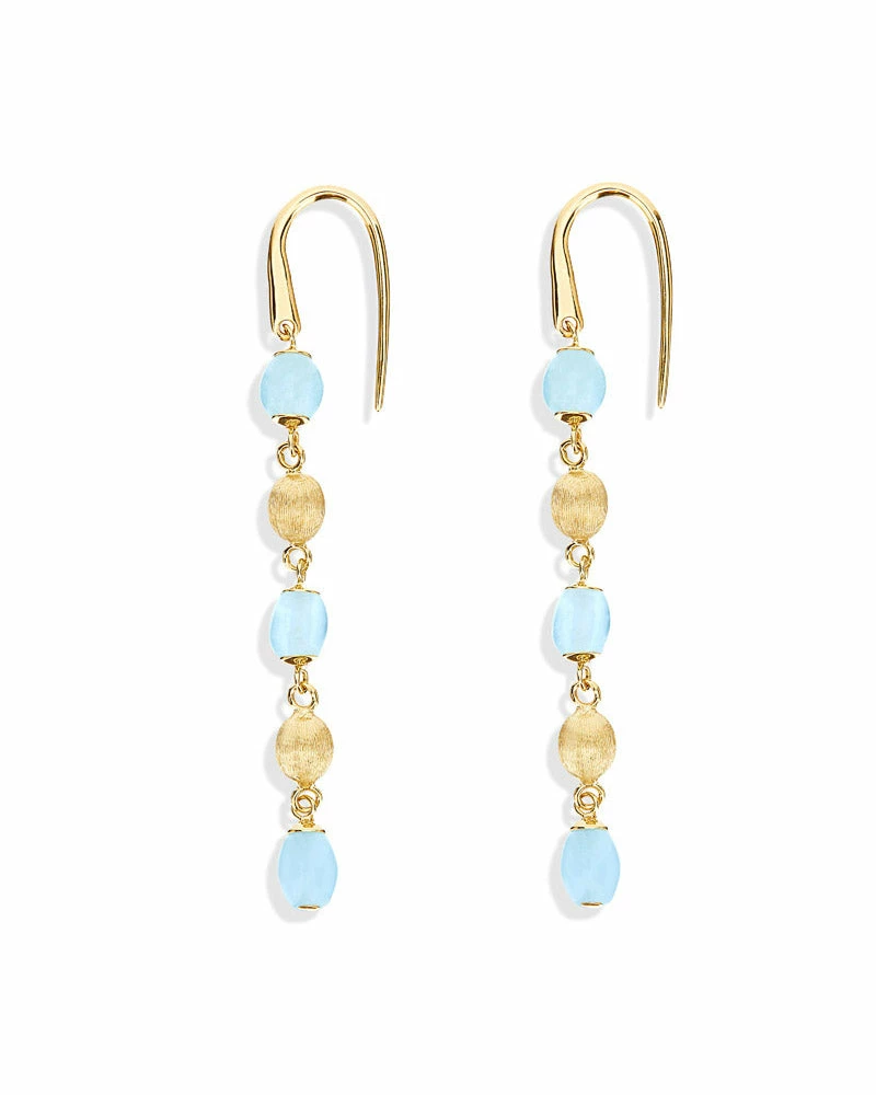 With their milky aquamarines and 18 kt gold, these earrings give each outfit the freshness and joyous warmth of Summer. A blue piece of sky and sea to always take with you.