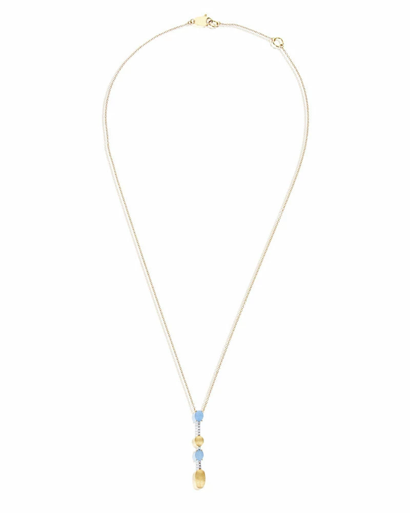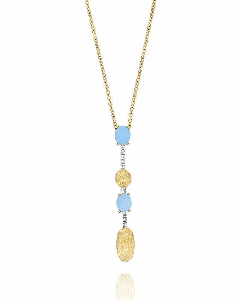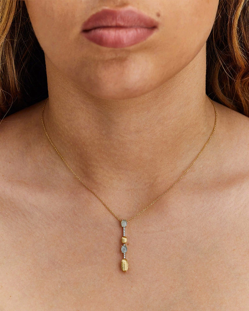Refined 18kt gold and milky aquamarine necklace crowned with elegant diamonds details. The sophisticated gold workmanship plays with light and with the natural stone, also known for enhancing inner growth and introspection.