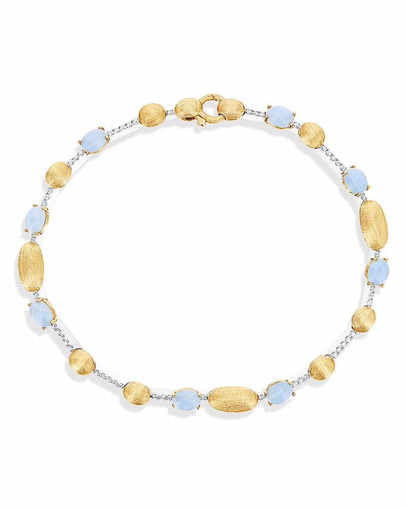 A delicate thread of milky aquamarine, 18k gold pearls, irregular and hand-engraved one by one and linked by sparkling diamonds. A poem of light to wrap around the wrist perfect for every look.