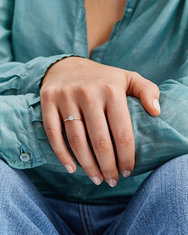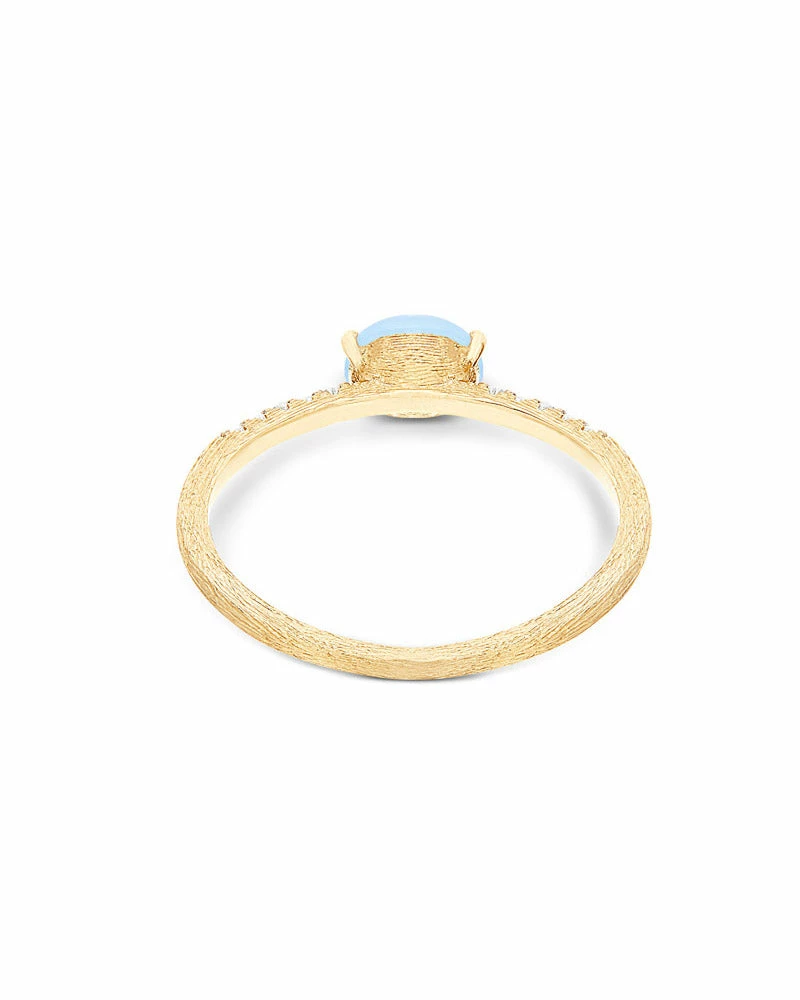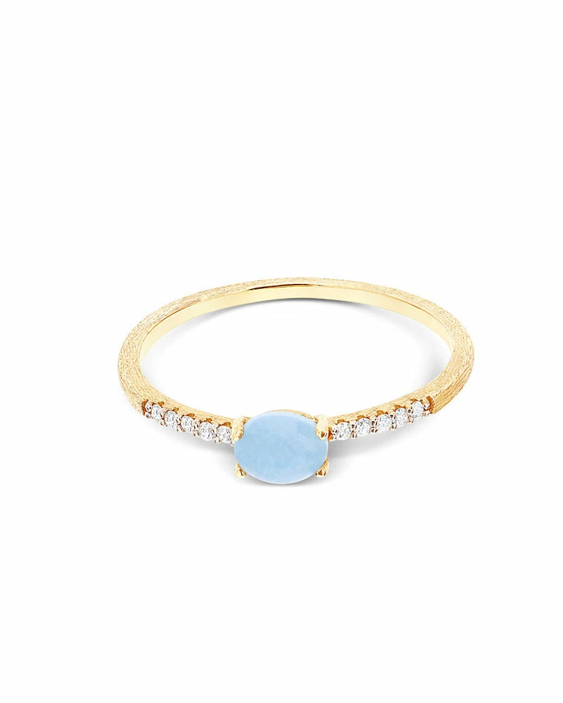 Refined 18 kt yellow gold ring, hand-engraved with the burin tool technique and crowned with delicate revières of diamonds and milky aquamarine, a natural stone also known for enhancing inner growth and introspection. A jewel characterized by a light elegance that can be always taken with you.