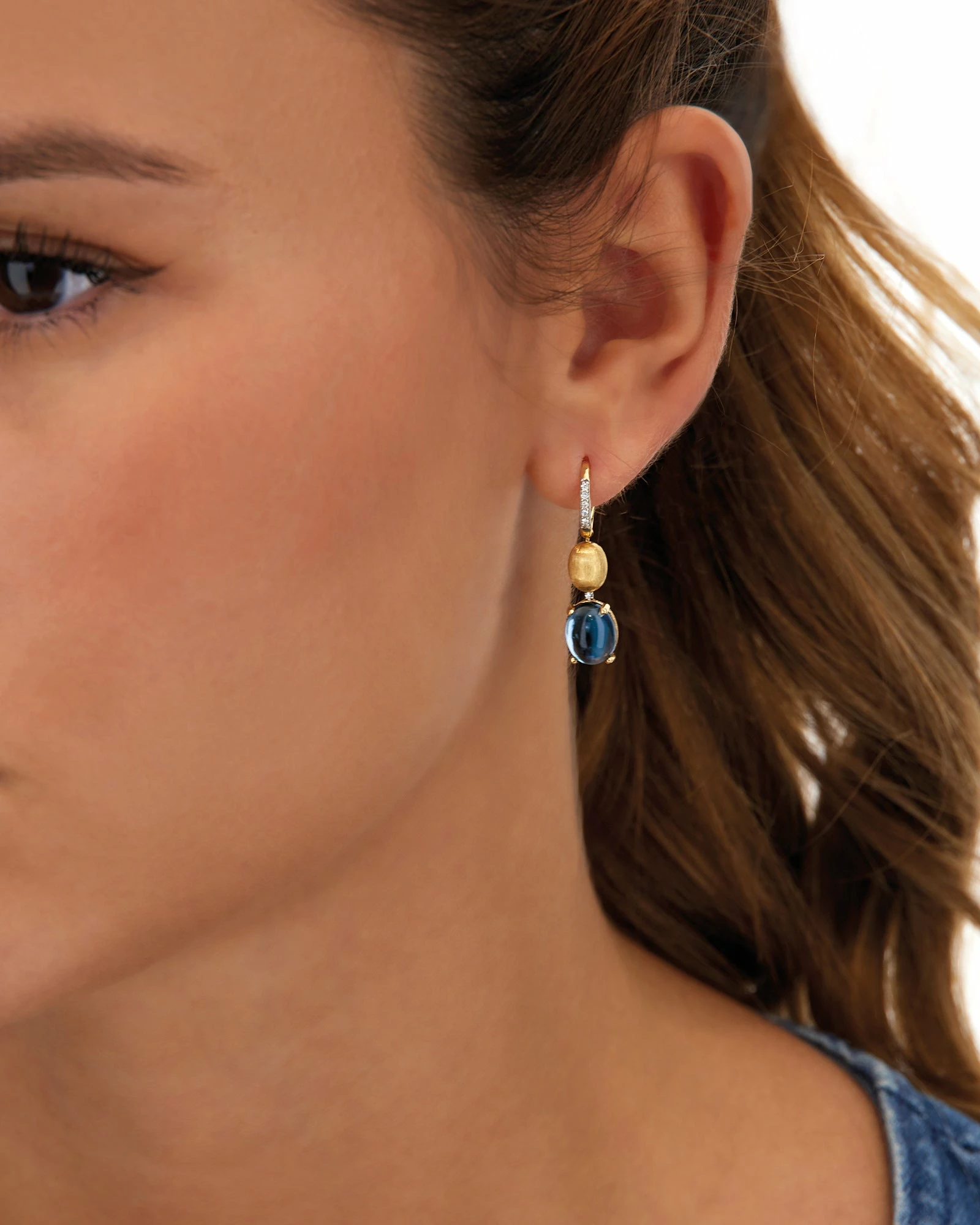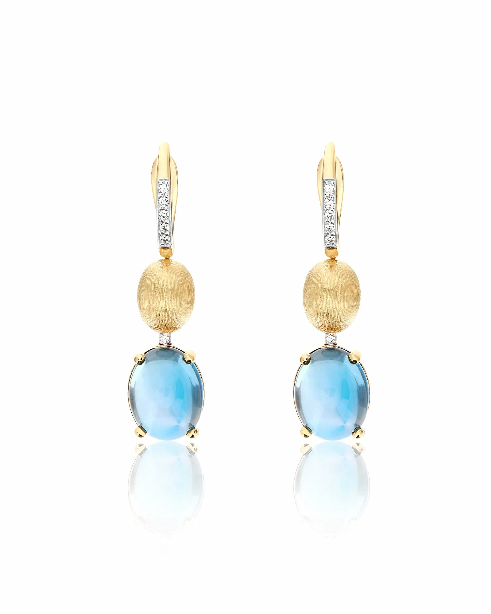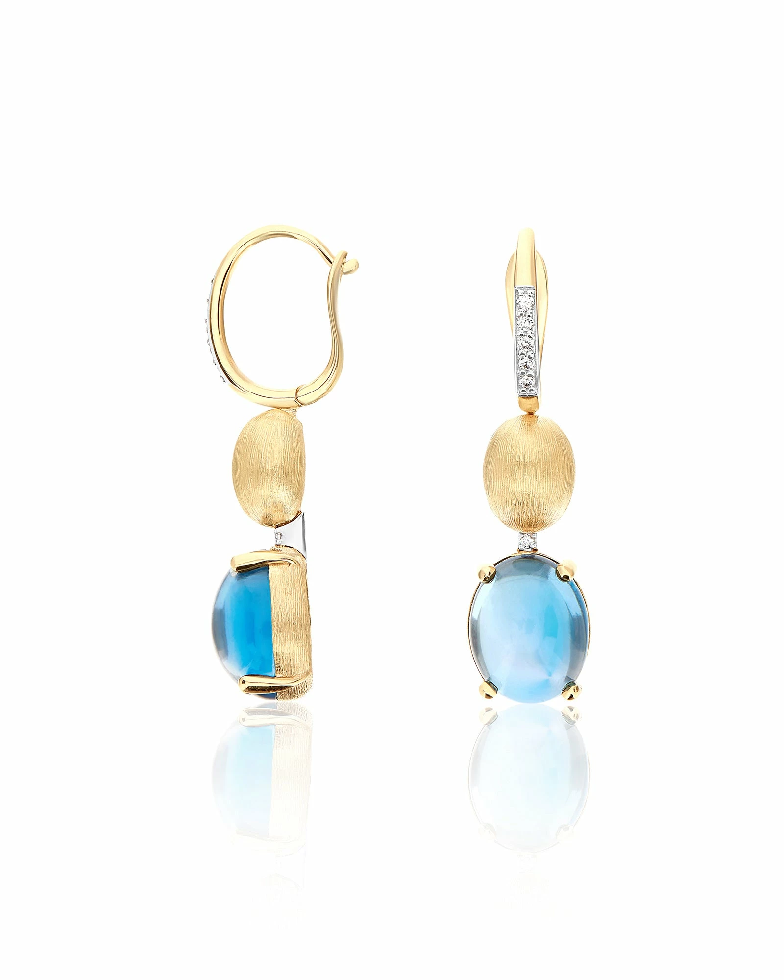 An earring with minimal elegance and that reminds of the colors of the ocean. The perfect combination of the 18kt gold boule, the bright diamonds and the precious London blue topaz boule makes this jewel, entirely handmade, a small work of art to wear.