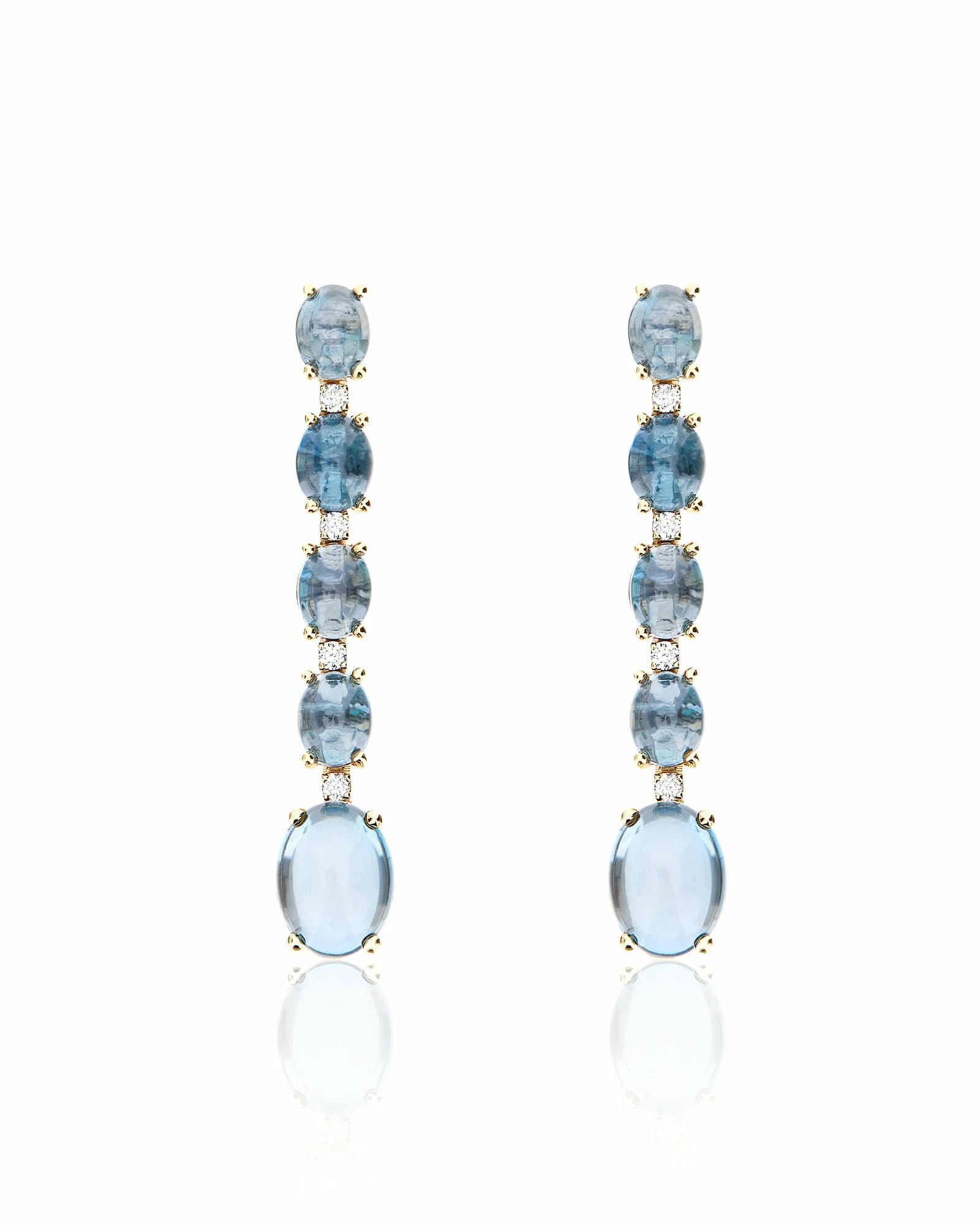 A very elegant rain of London Blue Topaz makes these earrings in 18kt gold and diamonds a masterpiece to wear. Natural stones enchant with their reflections and their intensity, giving life to a jewel with a timeless charm.