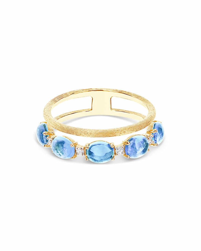 London Blue Topaz is a unique stone, with an intense and transparent color at the same time. Laura has chosen it for many of her creations, as in this double band ring in 18kt gold, diamonds and London Blue Topaz, an embracing masterpiece of craftsmanship and design. Â
