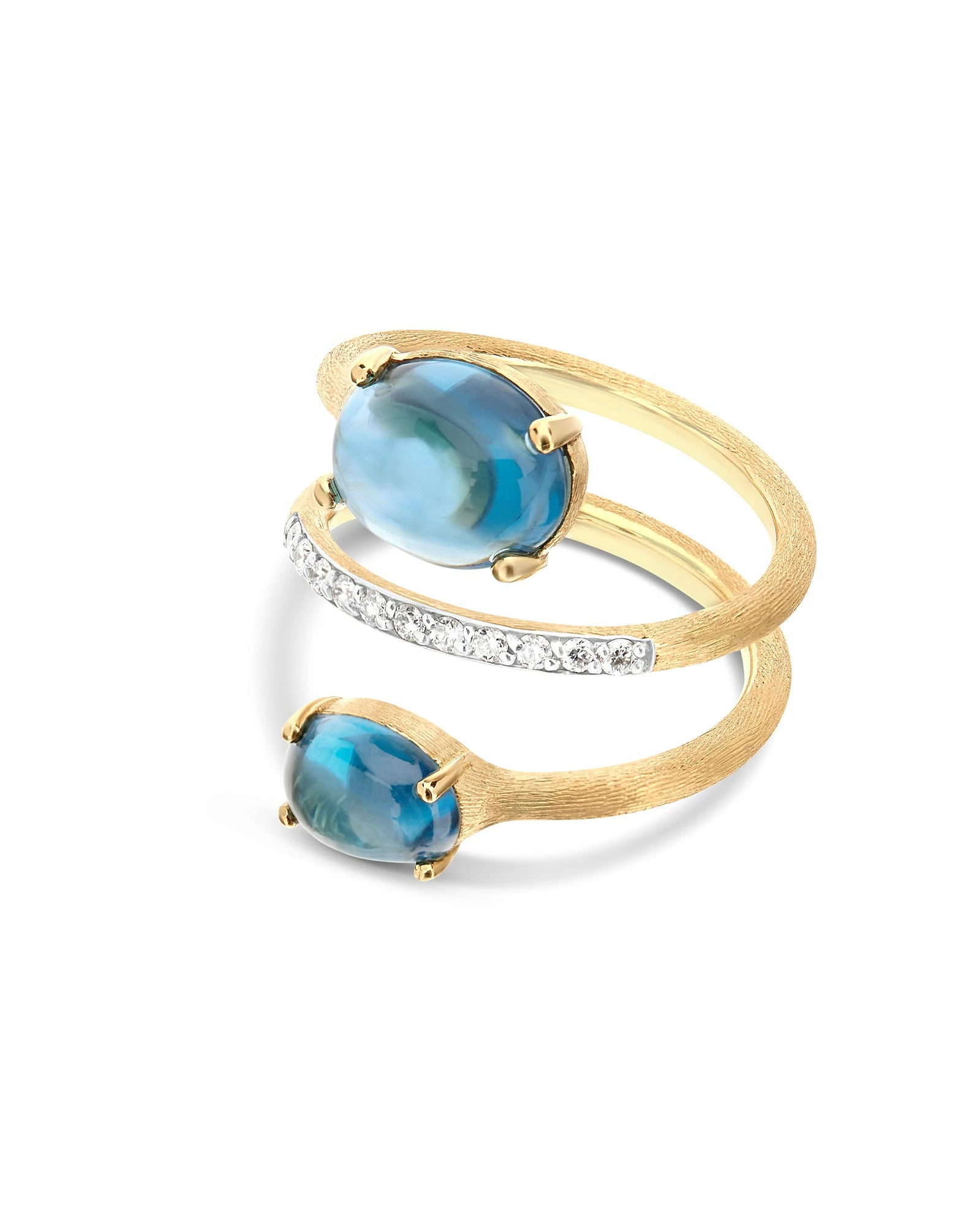 Intense London Blue Topaz stones embraced in yellow 18kt gold and white diamonds give life to a very refined ring, a piece of ocean to wear and always carry with you.