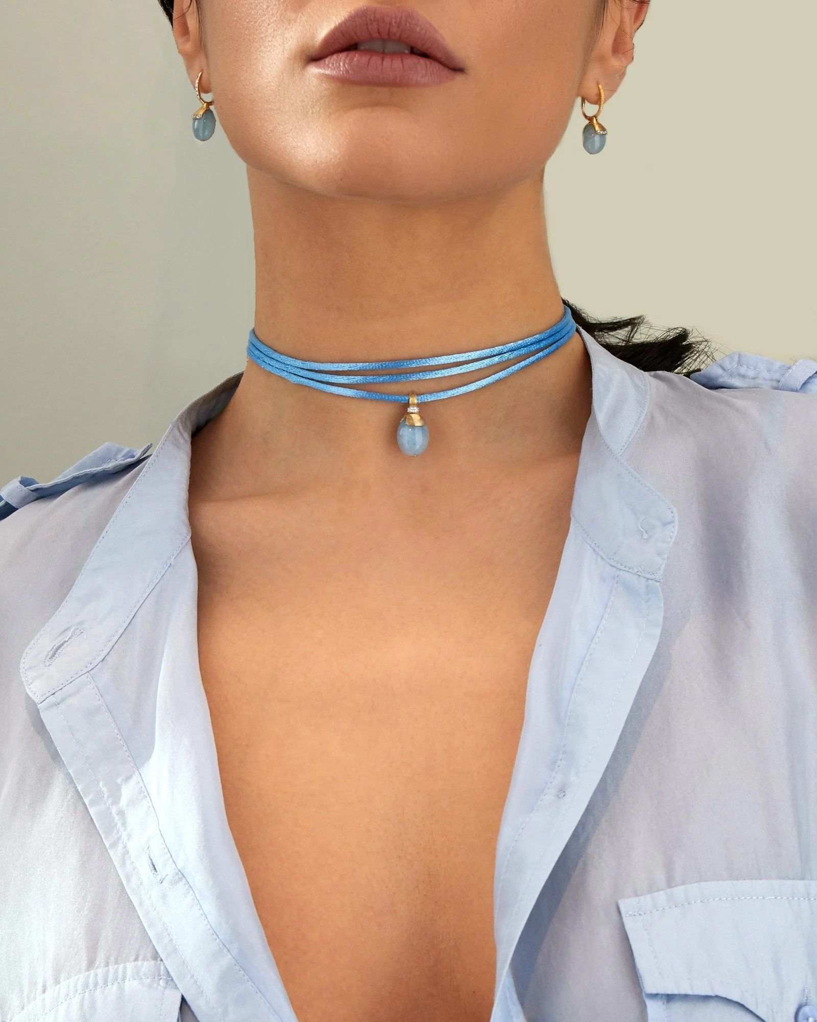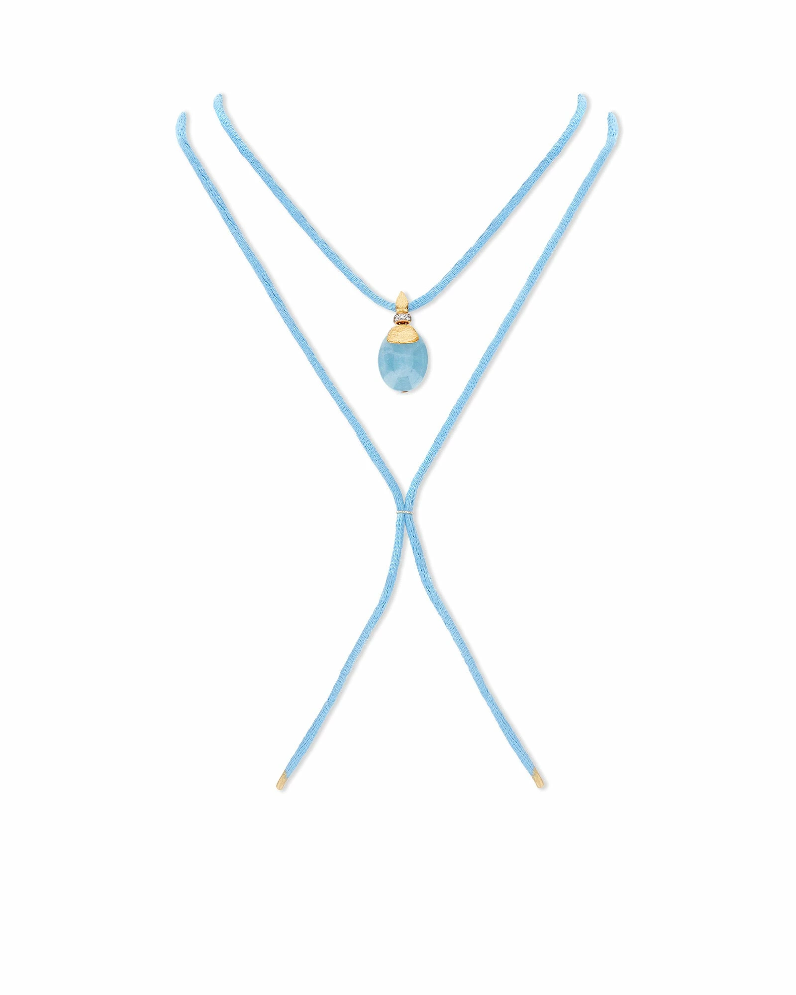 Refined milky aquamarine pendant, 18kt gold and diamonds. A necklace inspired by the magnificent Camargue salt pans, an unusual destination that enchants for the color of its waters and for the beautiful flamingos that populate them. Interpret this jewel as a bracelet or a necklace, transforming it into your faithful travel companion.