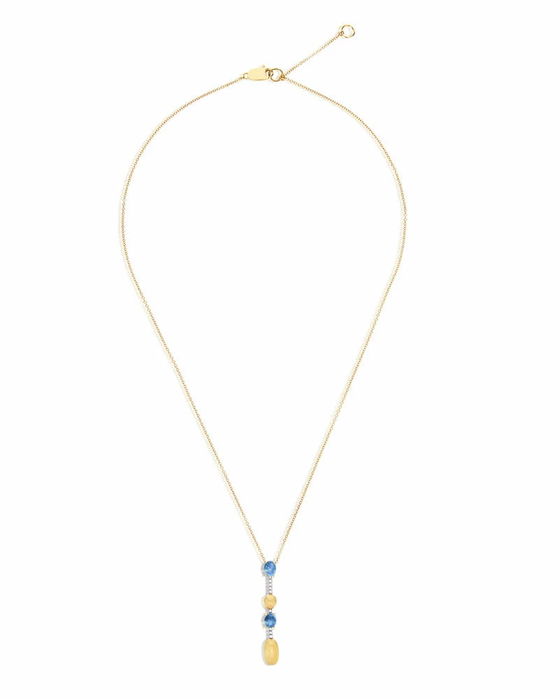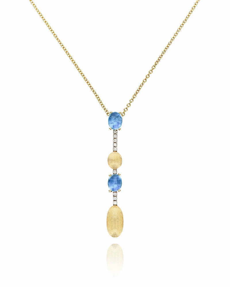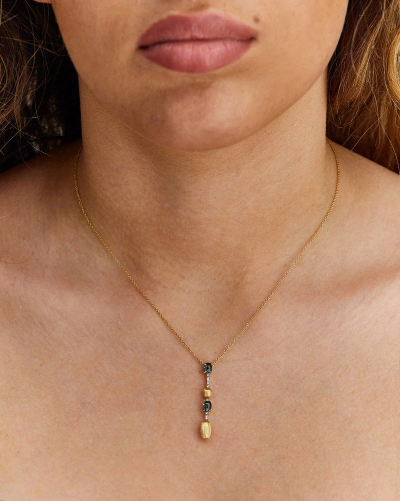 If there is a stone that takes us into the deep blue ocean, it is certainly the London Blue Topaz, one of the most beloved stones of Laura, who has chosen it for many of her jewels. Like this delicate handmade pendant, in 18kt gold, diamonds and London Blue Topaz, with a minimal and contemporary flavour.Nanis’ touch? The two little gold rings in the chain that allow you to adjust the necklace according to your tastes and your look.