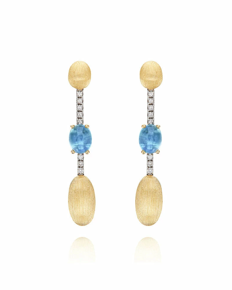 Among Laura’s favorite stones there is certainly the London Blue Topaz, or as she loves to call it the “denim tone topaz”, for its intense but transparent color, which perfectly matches the tones of jeans. We have used this natural stone in many of our jewels, such as in these beautiful earrings in 18kt gold, diamonds and London Blue Topaz, entirely handmade by our craftsmen, and which are perfect for a casual look. Laura, who tests each of her creations, has created special butterflies for these earrings, equipped with a little plate to support the upper part of the earring, ensuring a perfect wearability.Her advice? If you have a double hole, combine these earrings with their shorter version!