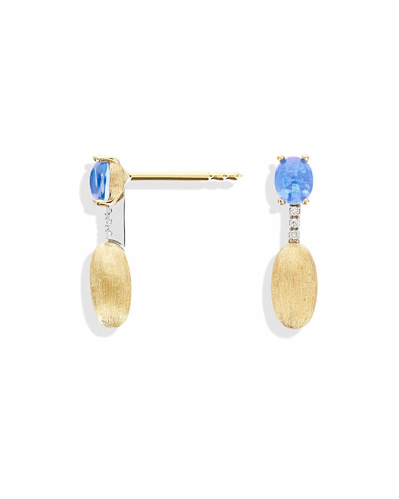 Among Laura’s favorite stones there is certainly the London Blue Topaz, or as she loves to call it the “denim tone topaz”, for its intense but transparent color, which perfectly matches the tones of jeans. We have used this natural stone in many of our jewels, such as in these beautiful earrings in 18kt gold, diamonds and London Blue Topaz, entirely handmade by our craftsmen, and which are perfect for a casual look. Laura, who tests each of her creations, has created special butterflies for these earrings, equipped with a little plate to support the upper part of the earring, ensuring a perfect wearability.Her advice? If you have a double hole, combine these earrings with their longer version!