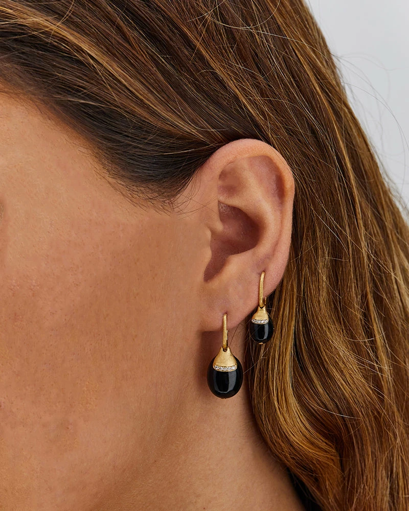 Refined 18kt gold and black onyx earring crowned with elegant diamonds details. The sophisticated gold workmanship plays with light, reflecting it suggestively, and embraces the natural stone like a shell, also known for its ability to bring balance to emotions and to give mental clarity.