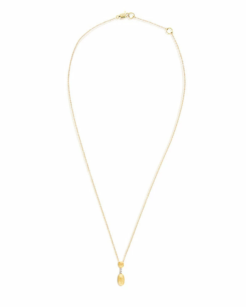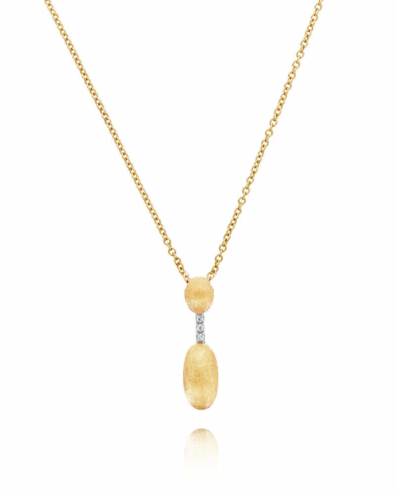 The delicacy of elegance meets the talent in this shiny necklace that marries diamonds with two 18 kt gold boules, hand-engraved by our artisans.