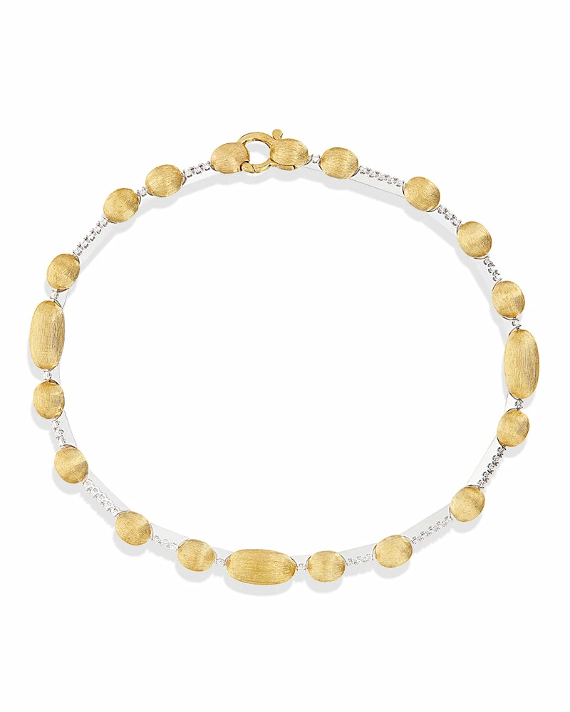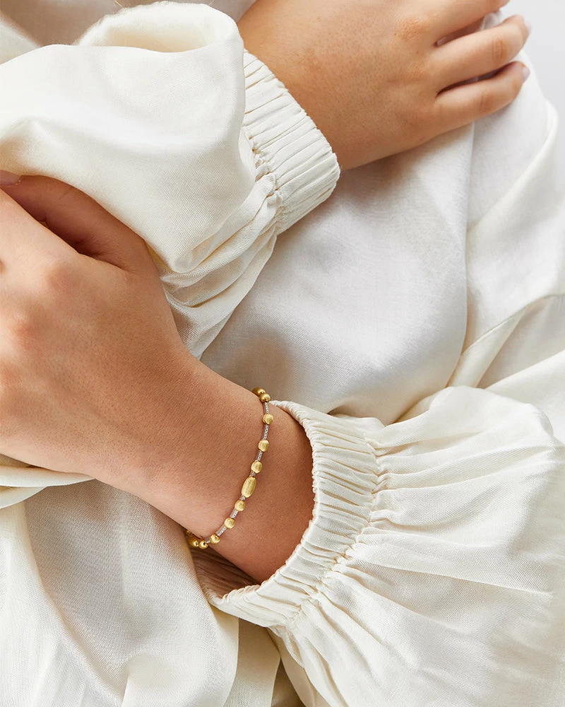 A rain of 18kt gold pebbles, sinuous, round and engraved by wise artisan hands, which reconnect in a string of bright diamonds, creating a bracelet that becomes a refined play of light.