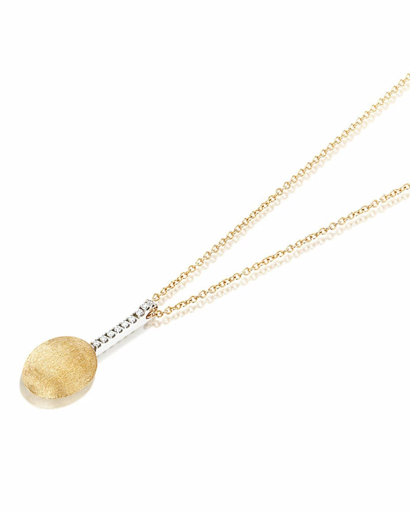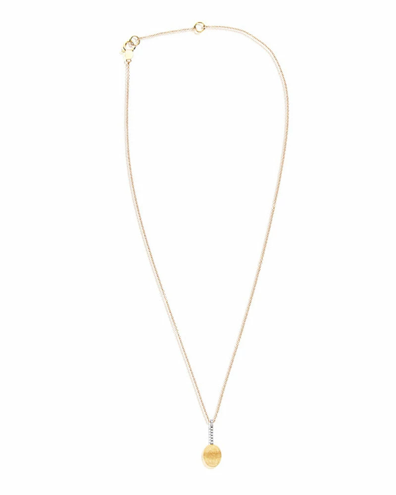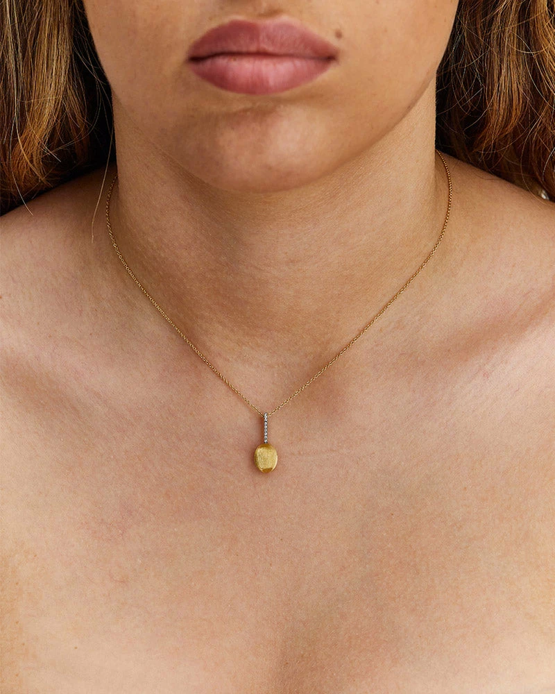 The delicacy of elegance meets the talent in this shiny necklace that marries diamonds with a 18 kt gold boule, hand-engraved by our artisans.