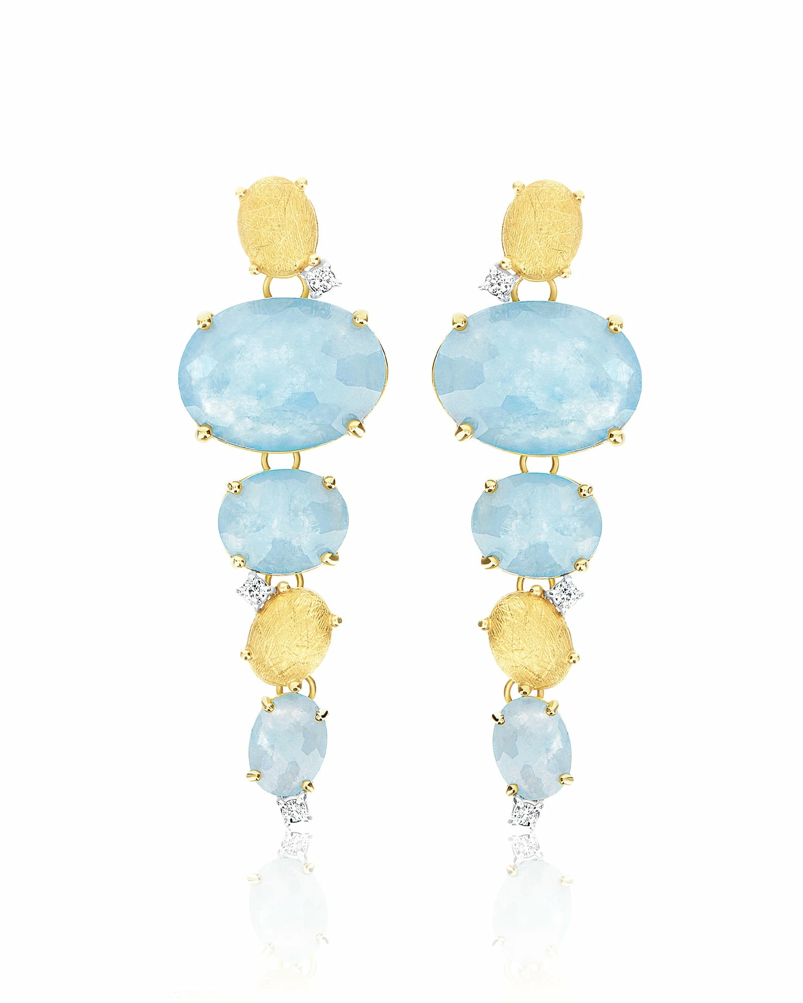 Milky aquamarines and 18 kt gold of IPANEMAÂ earrings give each outfit the freshness and joyous warmth of summer. Laura, who tests each of her creations, has created special butterflies for these earrings, equipped with a little plate to support the upper part of the earring, ensuring a perfect wearability.