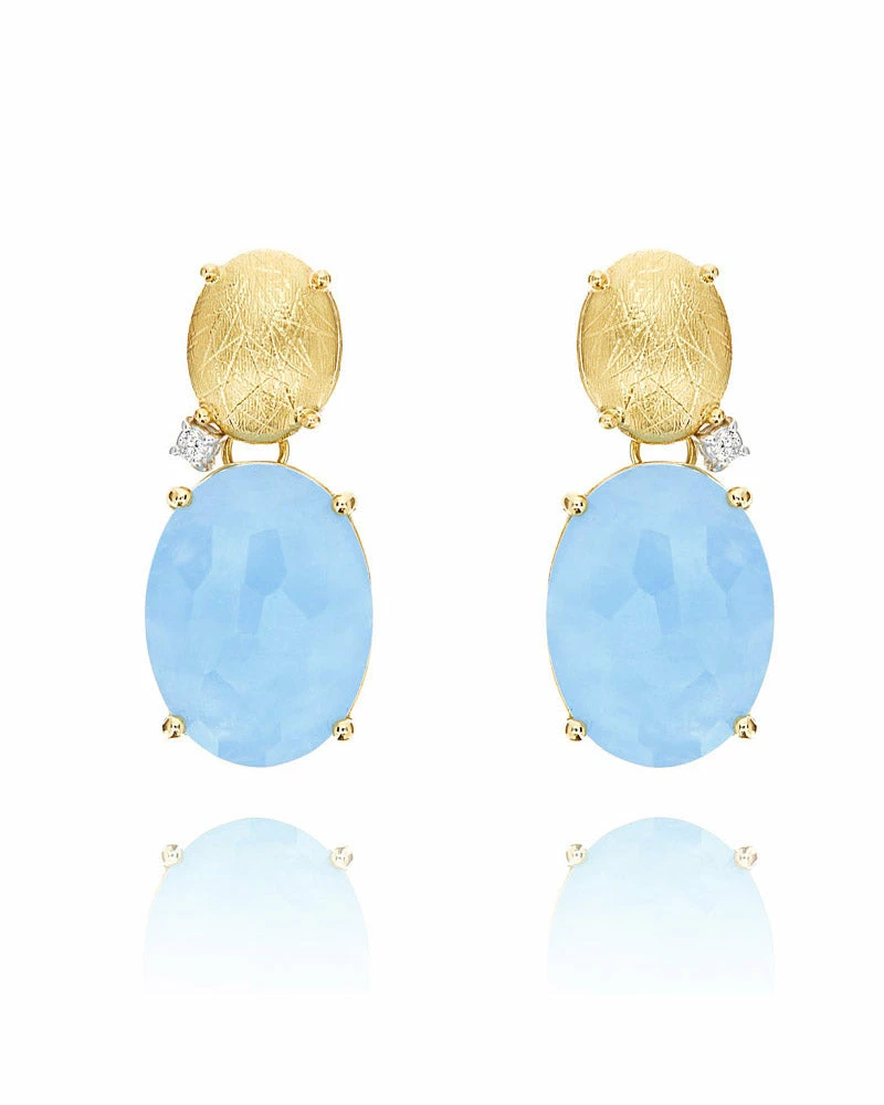 Milky aquamarines and 18 kt gold of IPANEMA earrings give each outfit the freshness and joyous warmth of Summer. A blue piece of sky and sea to always take with you. Laura, who tests each of her creations, has created special butterflies for these earrings, equipped with a little plate to support the upper part of the earring, ensuring a perfect wearability.