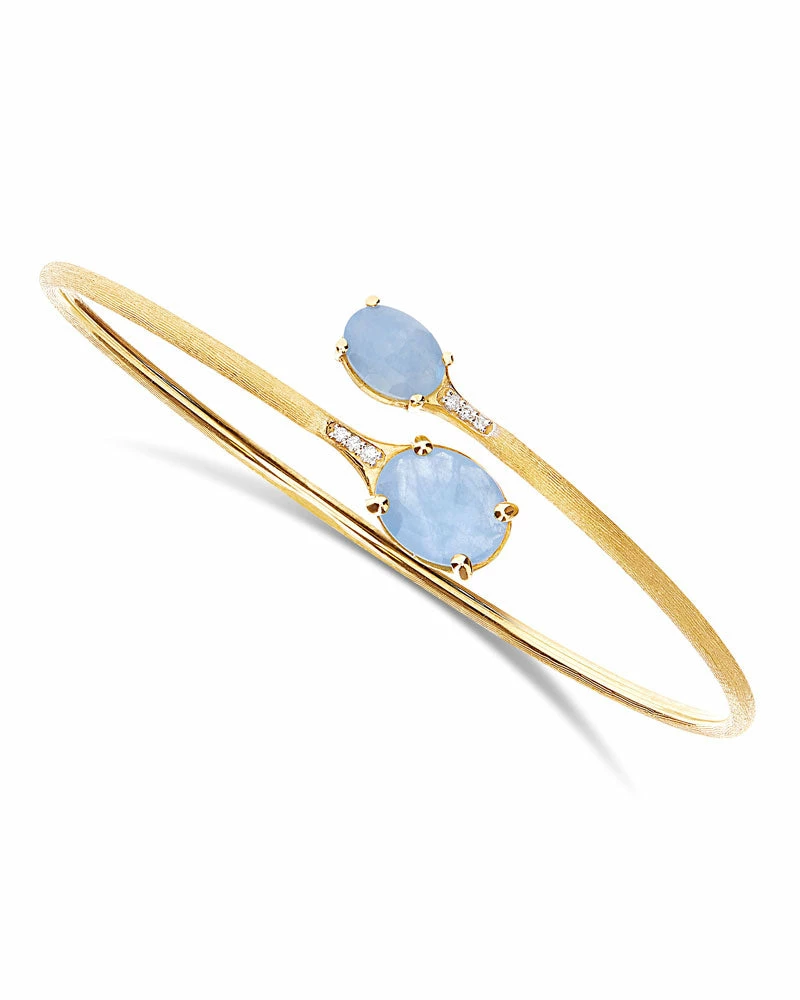 Among Laura’s favourite stones by there is undoubtedly the milky aquamarine, characterized by internal veins that some consider imperfections, while for her they are exactly what make it unique! This charming stone is interpreted with grace and lightness in this 18kt gold and diamonds bangle, a jewel designed to cuddle you and take you on all your adventures, and which will surprise you not only for its beauty but also for its lightness and flexibility.