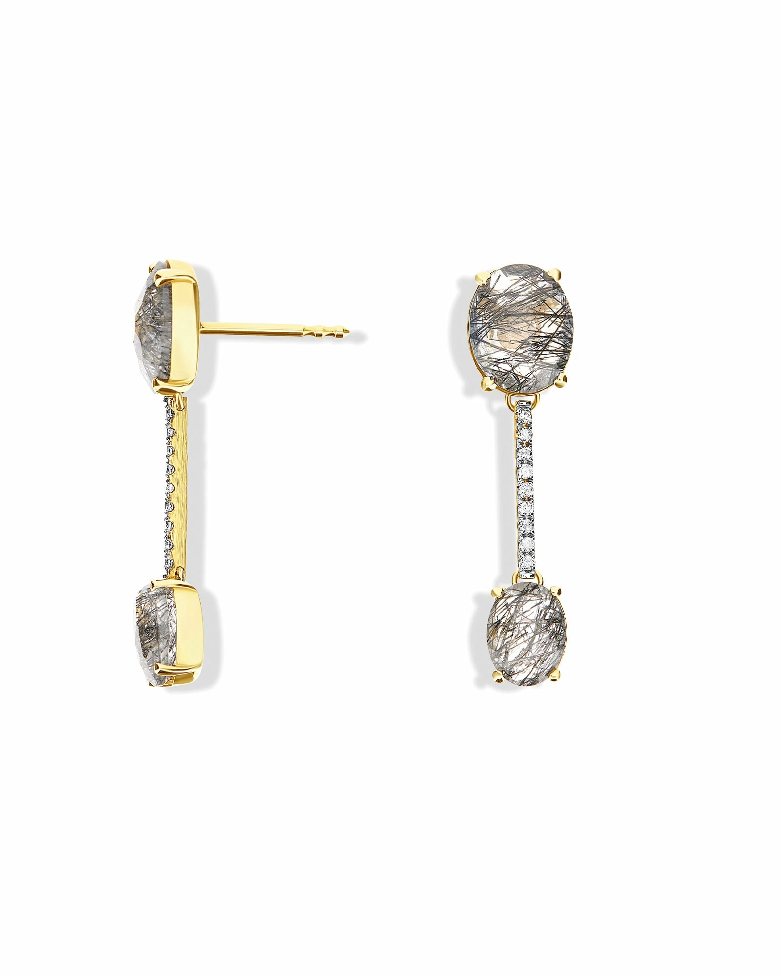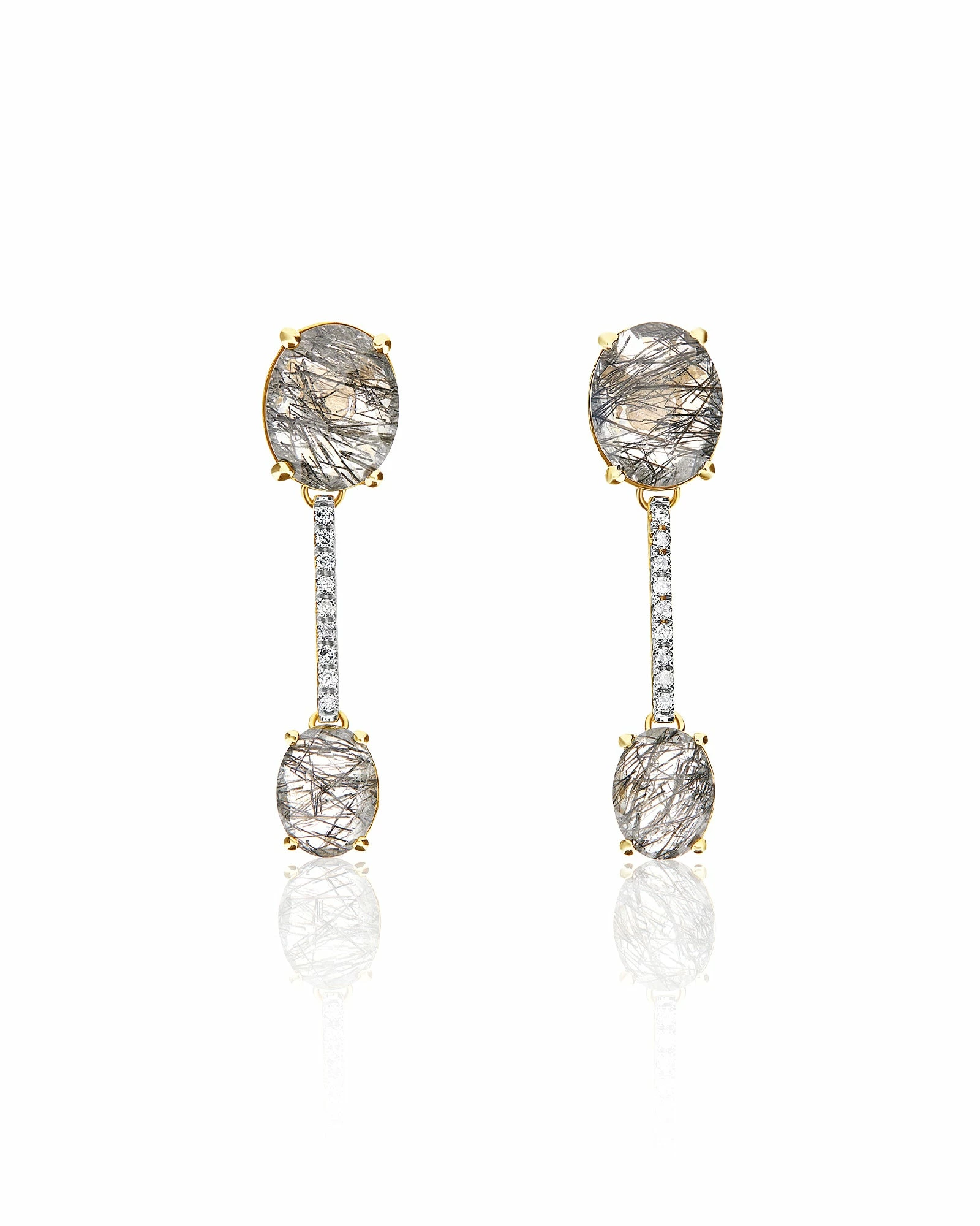 Refined earrings in 18kt gold and gray rutilated quartz crowned with elegant diamond details. Laura, who tests each of her creations, then created special butterflies for these earrings with a blade designed to support the upper part of the earring, ensuring a perfect fit.