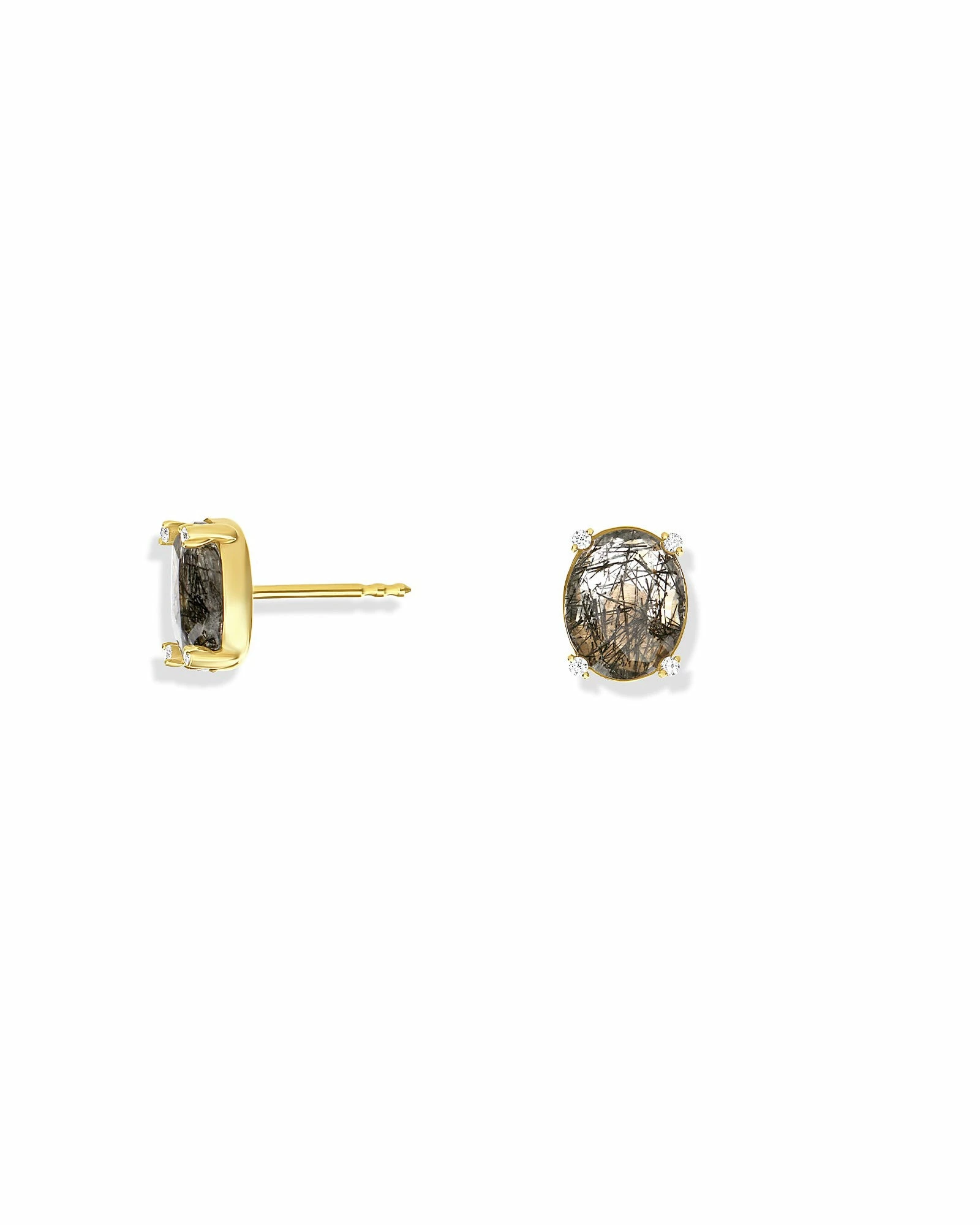 Refined lobe earrings in 18kt gold and gray rutilated quartz crowned with elegant diamond details. Laura, who tests each of her creations, then devised special butterflies for this jewel with a blade designed to support the upper part of the earring, ensuring a perfect fit. Our advice? If you have more ear holes, wear this creation together with the largest (OS26-576) and smallest (OS28-576) model of the series!