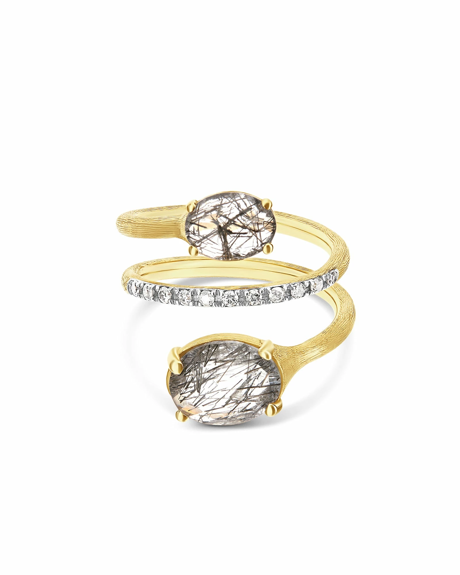 Simplicity and extreme elegance come together in this spiral ring in 18kt gold, diamonds and rutilated quartz with a sinuous design. A jewel characterized by the incredible internal streaks of its stone, which make this creation an ode to the uniqueness and authenticity of each of us.