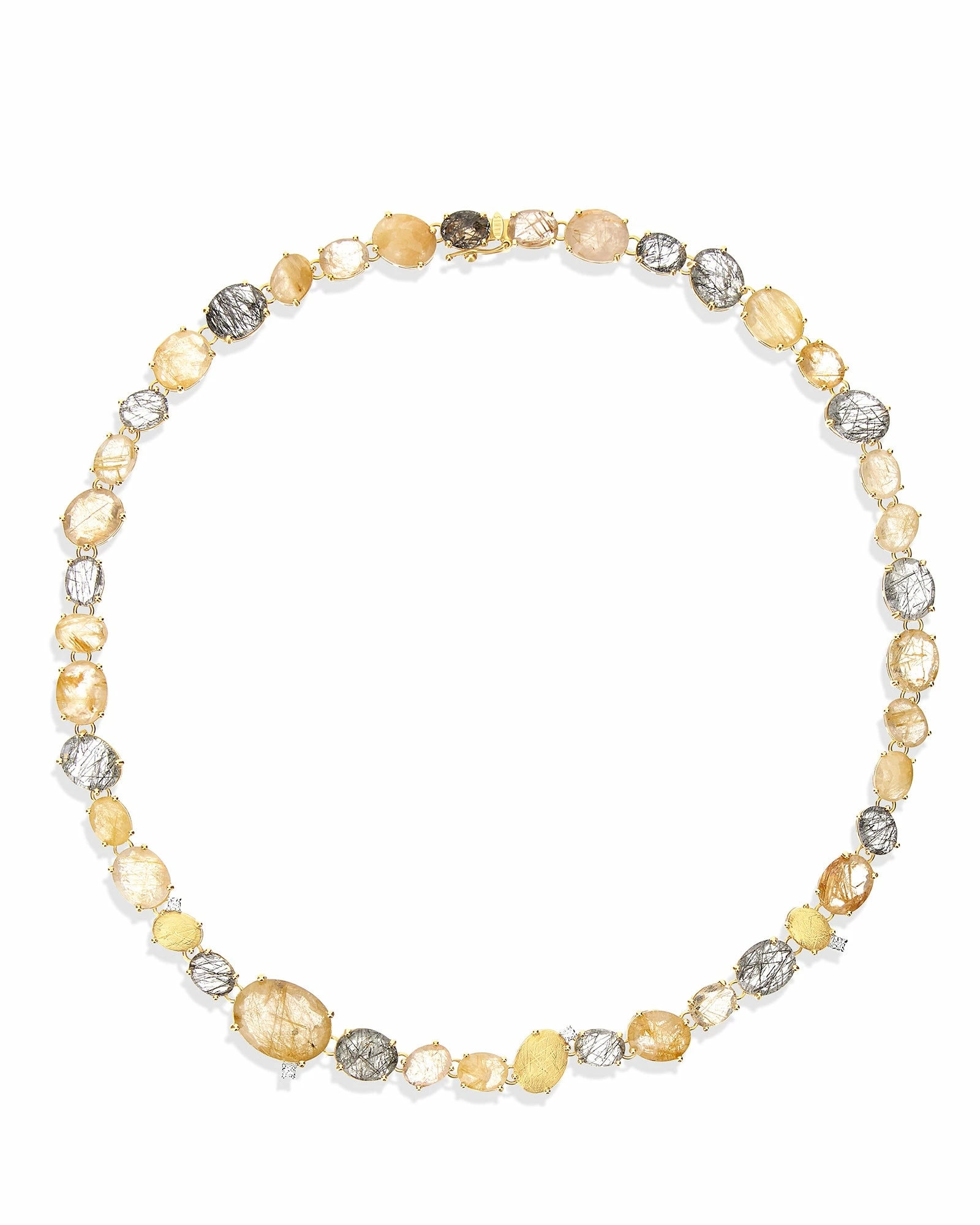 A sparkling expanse of gray and yellow rutilated quartz and 18kt gold studded with diamonds: let yourself be overwhelmed by the vitality and extraordinary nature of this necklace, made unique by the incredible internal streaks of this stone, one of our absolute favorites.