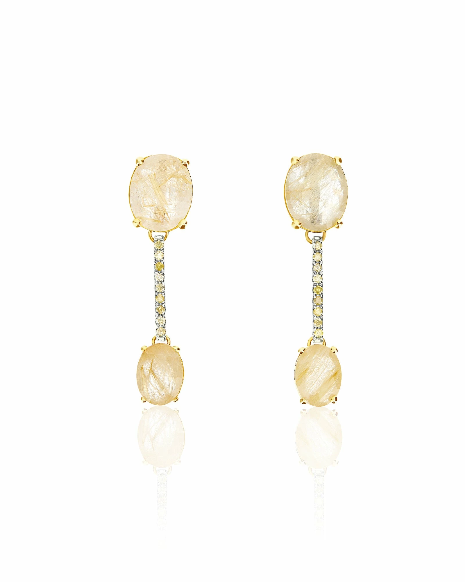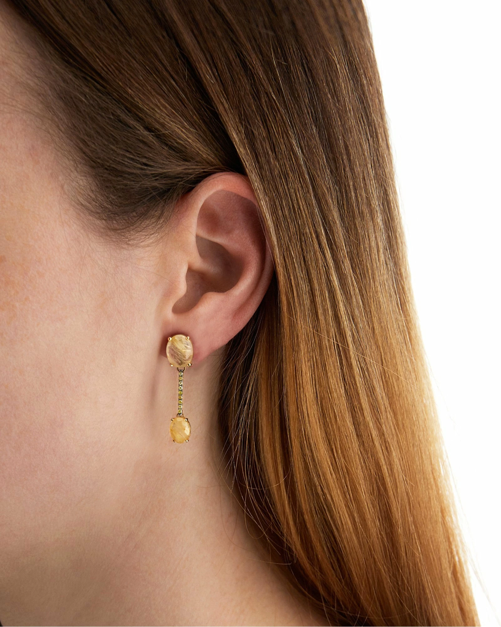 Refined 18kt gold and yellow rutilated quartz earrings crowned with elegant diamond details. Laura, who tests each of her creations, then created special butterflies for these earrings with a blade designed to support the upper part of the earring, ensuring a perfect fit.