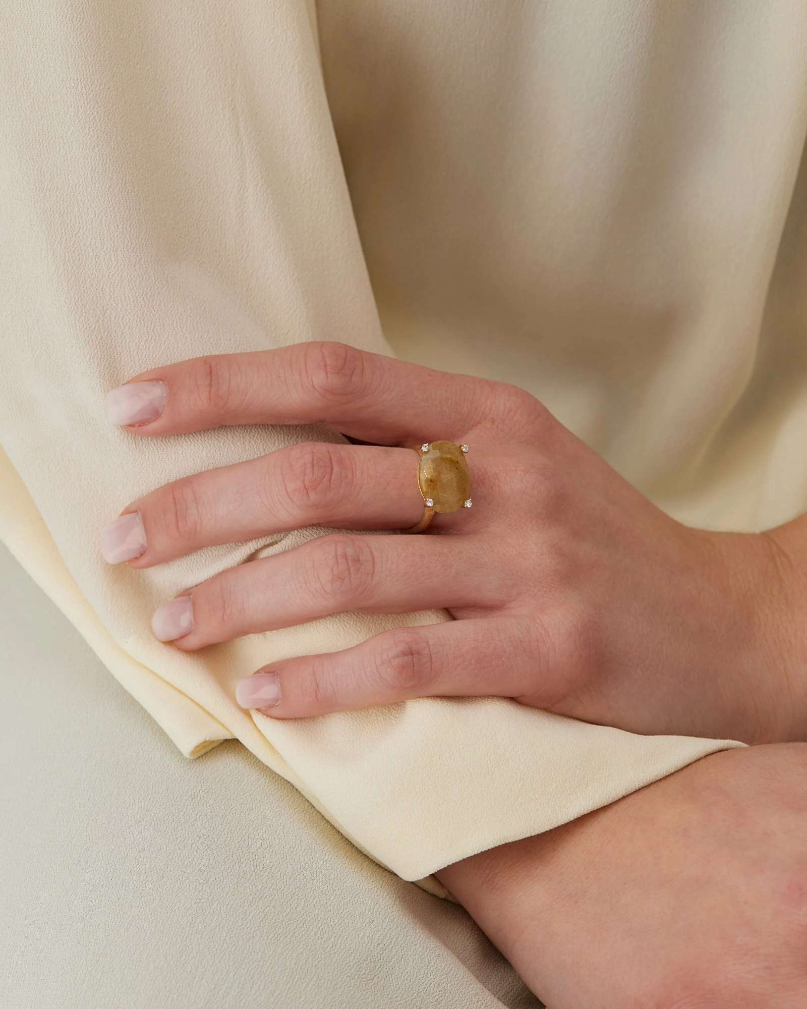 18kt yellow gold band ring, hand engraved with the burin technique and crowned by one of our most loved stones: the extraordinary yellow rutilated quartz, made unique by its colored rutile crystals. Four diamonds, placed on the sides of the stone, seem to seal its timeless charm. A refined jewel, designed for special occasions but also to create a perfect contemporary style, especially when combined with its medium (AS12-576) or small (AS20-576) version.