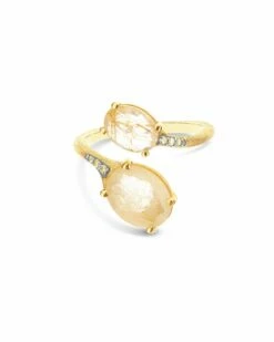 Precious rutilated quartz stones embraced in 18kt yellow gold and diamonds give life to a ring with a free movement and an embracing design. A jewel that strikes for its elegance and made unique by the extraordinary inside streaks of this gem, one of our favorites for its uniqueness.