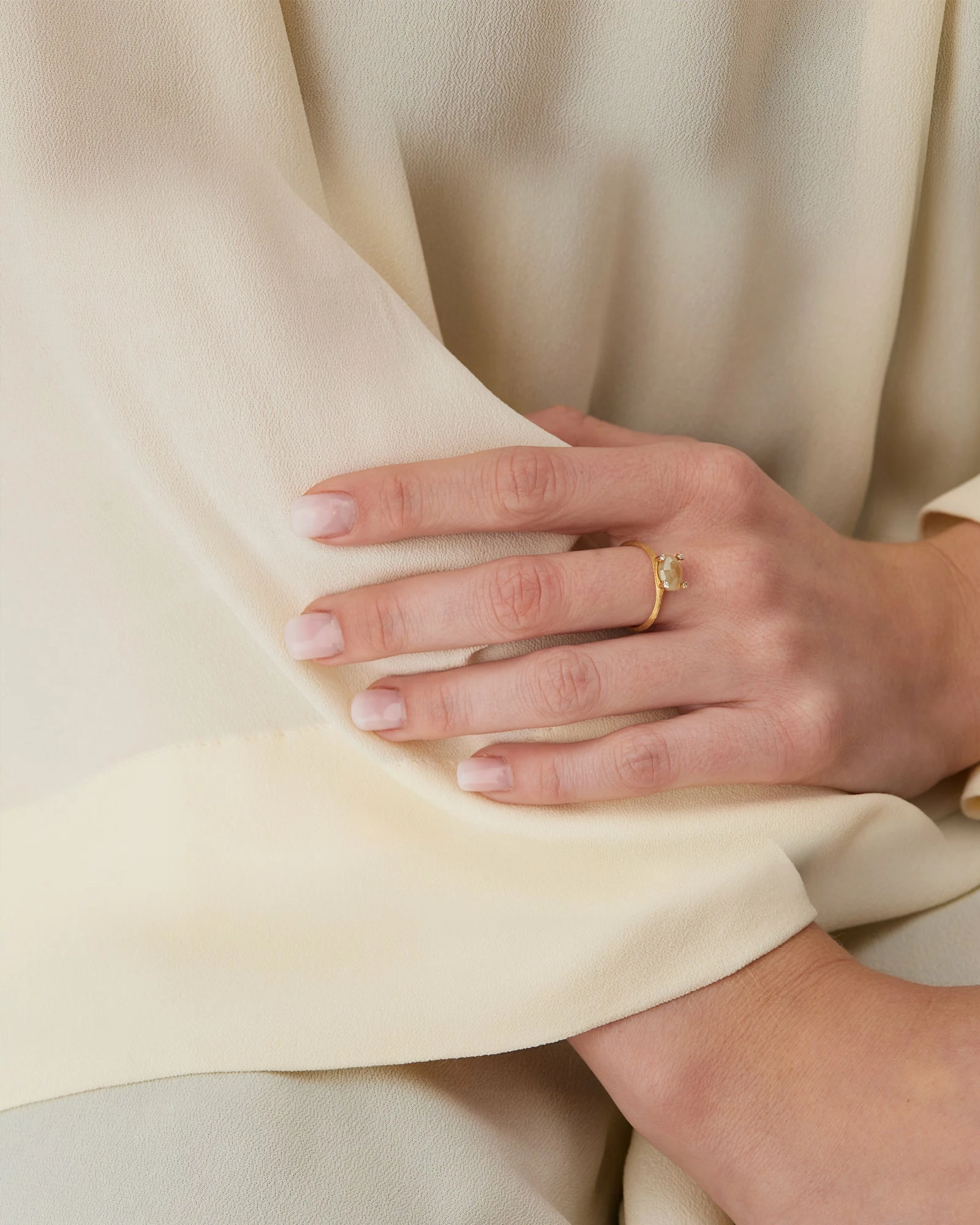 Are you ready to dive into the beautiful internal crystals of this rutilated quartz? Let yourself be seduced by this stone and its extraordinary uniqueness, its sparkling diamonds and the reflections of hand-engraved 18kt gold! A refined jewel, designed for special occasions but also to create a perfect contemporary style, especially when combined with its larger (AS2-576) or intermediate (AS12-576) version.