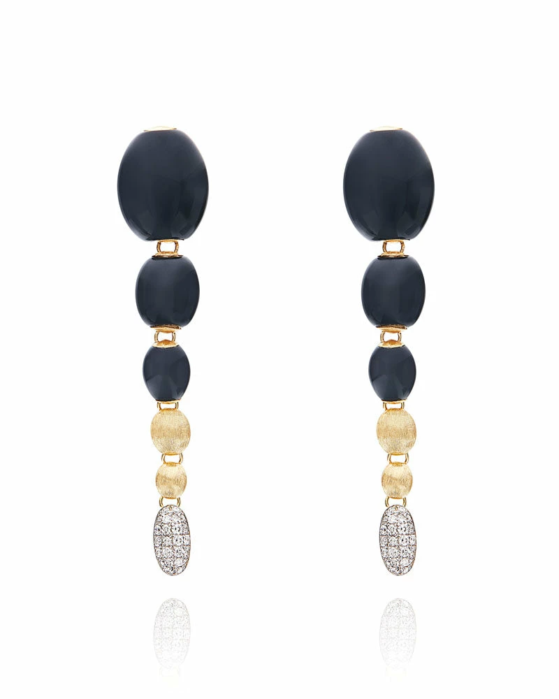 A cascade of onyx and 18 kt gold, sealed by a drop of diamonds: these earrings won’t let you go unnoticed. Laura, who tests each of her creations, has created special butterflies for these earrings, equipped with a little plate to support the upper part of the earring, ensuring a perfect wearability.