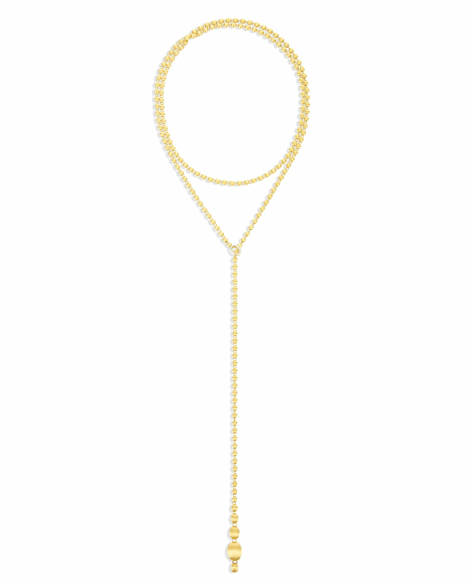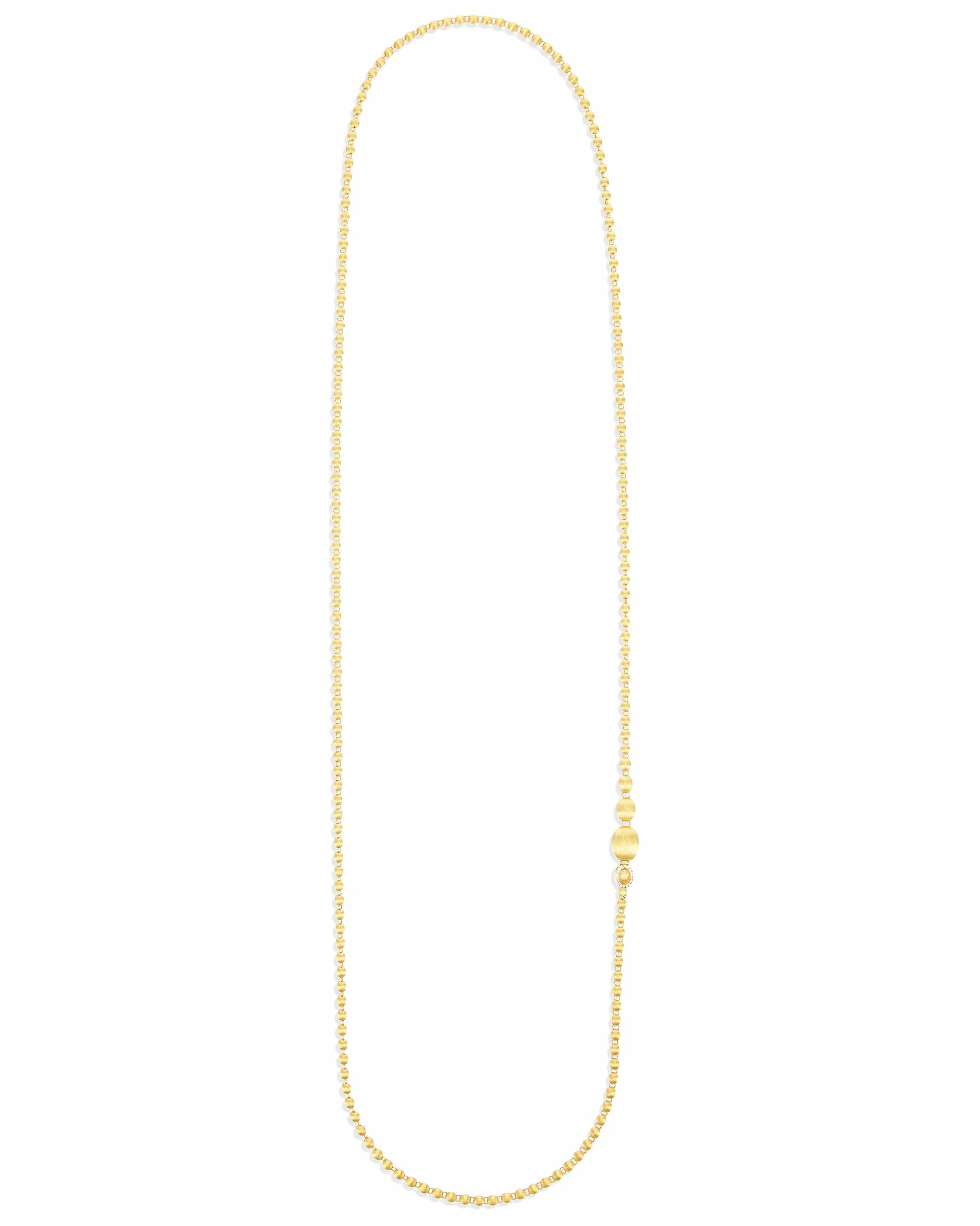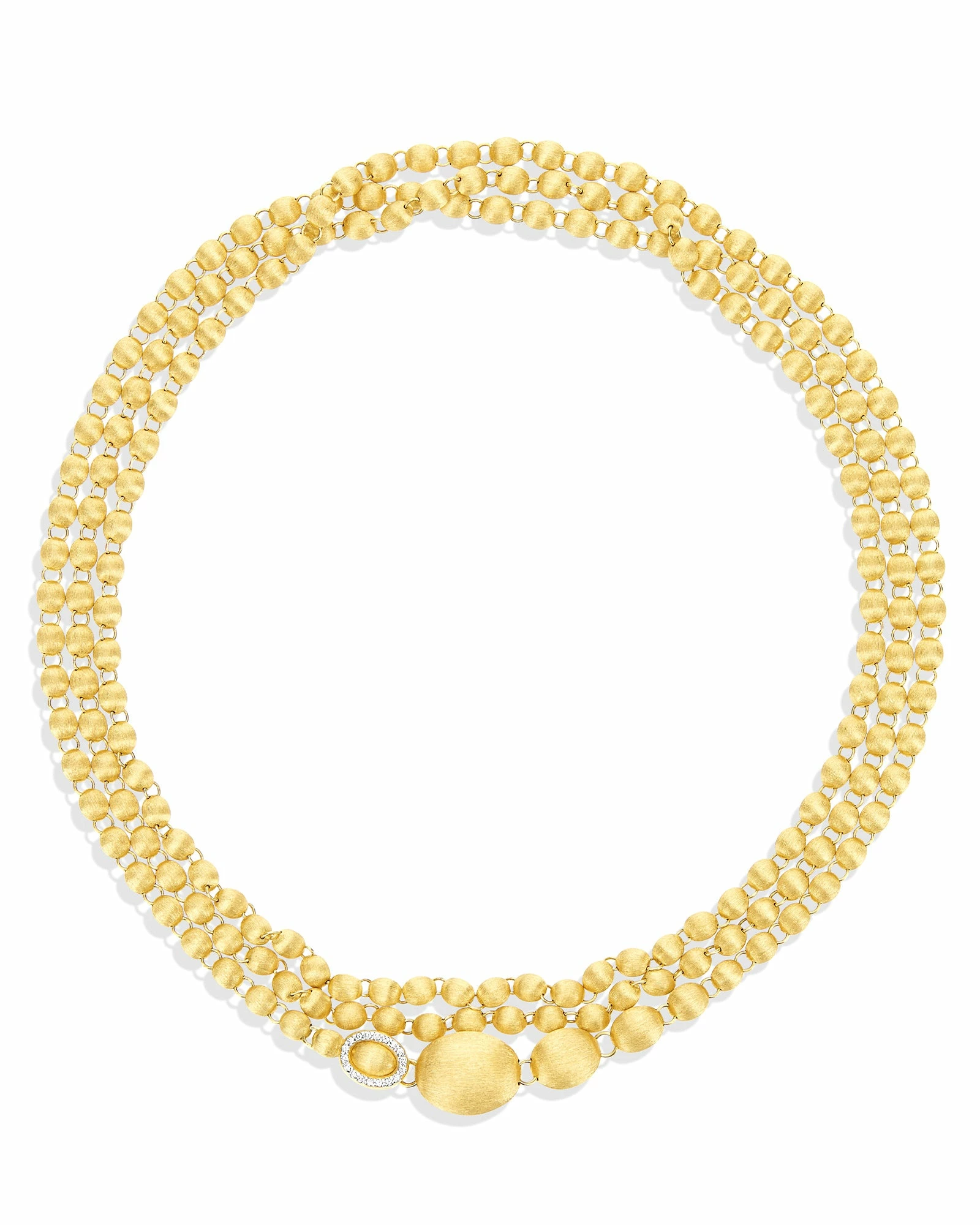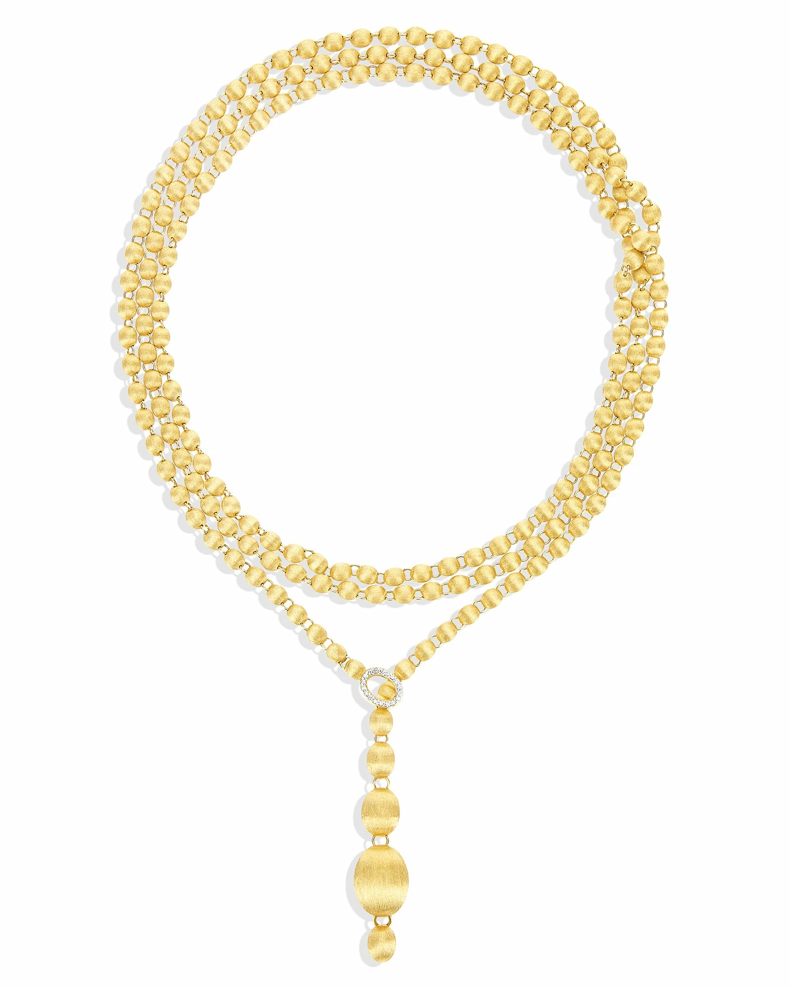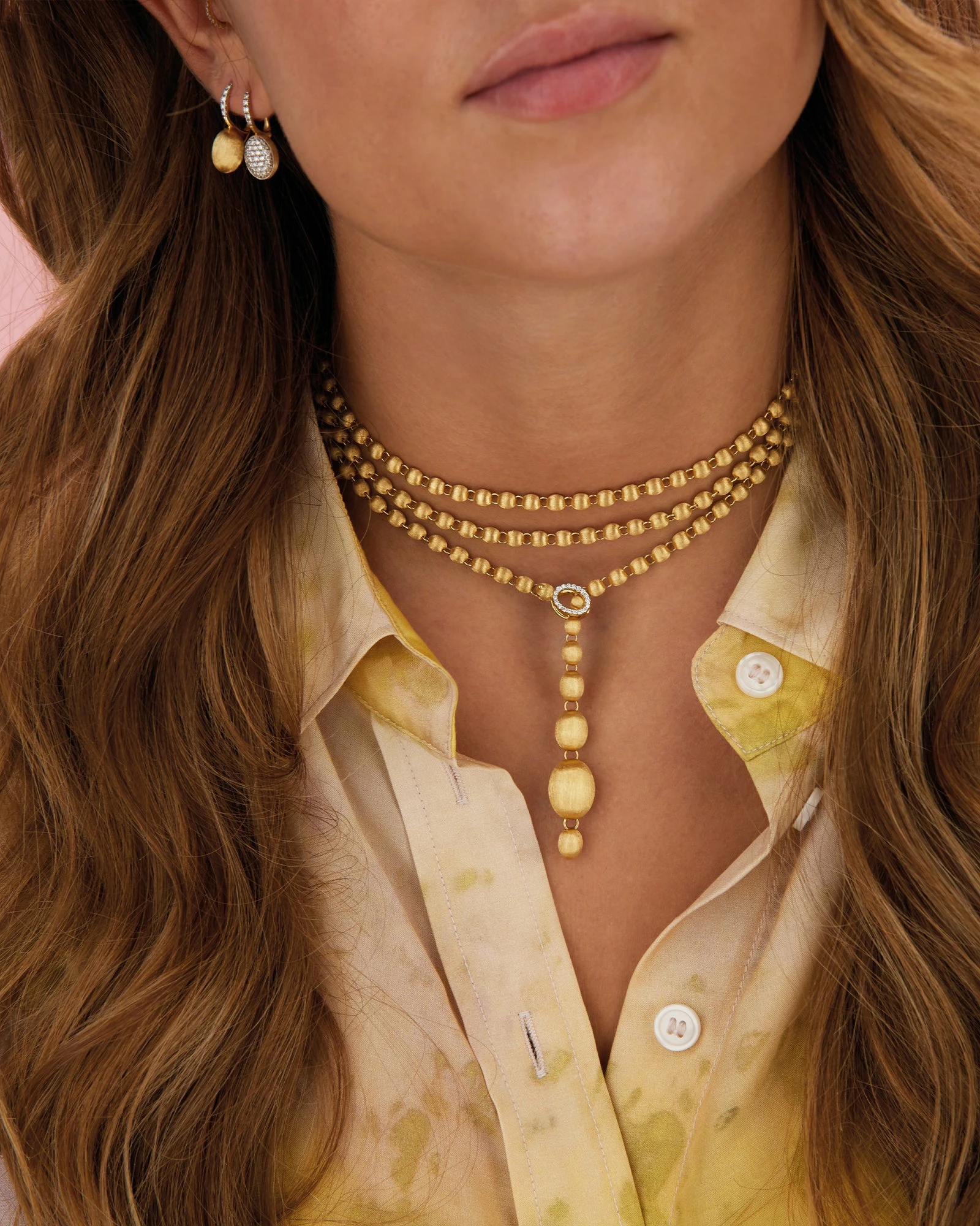 To characterize this necklace in 18kt gold and diamonds, its elegant gold pearls, hand-engraved one by one with the very ancient burin technique and surprisingly light.