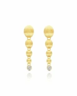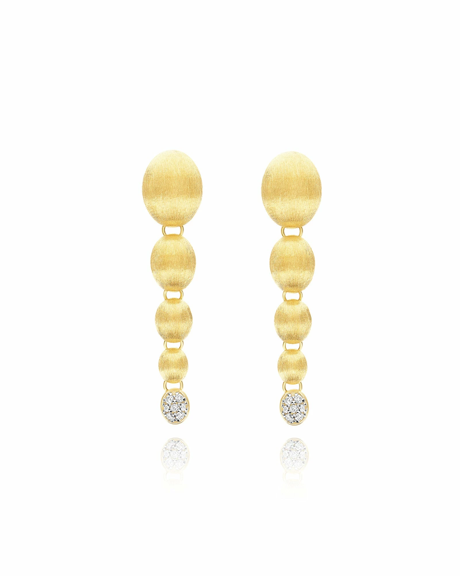 Elegant 18kt gold boules, hand-engraved with artisanal wisdom, chase each other in these contemporary earrings crowned with a diamonds drop. Laura, who tests each of her creations, has created special butterflies for these earrings, equipped with a little plate to support the upper part of the earring, ensuring a perfect wearability.