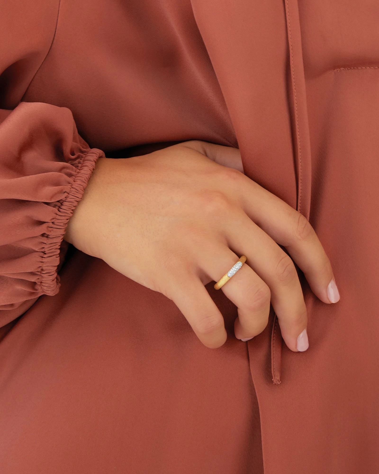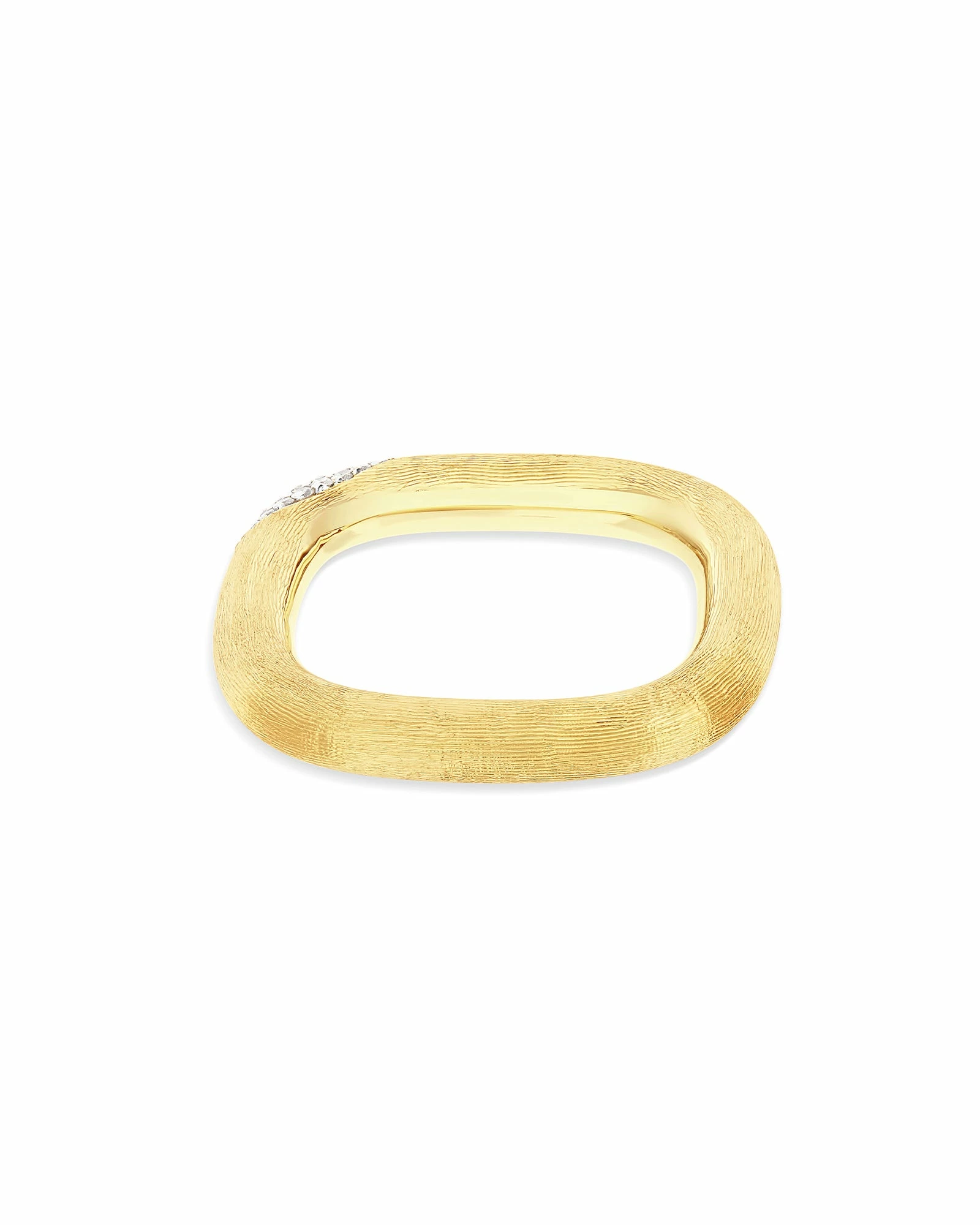 In this 18kt gold ring, entirely handmade like every Nanis jewel, Laura wanted to revisit in a sinuous way the classic shape of the square, smoothing its corners and embellishing it with an original diamonds pavรฉ. A timeless jewel perfect on every occasion, that seduces for its essential refinement and sinuosity.