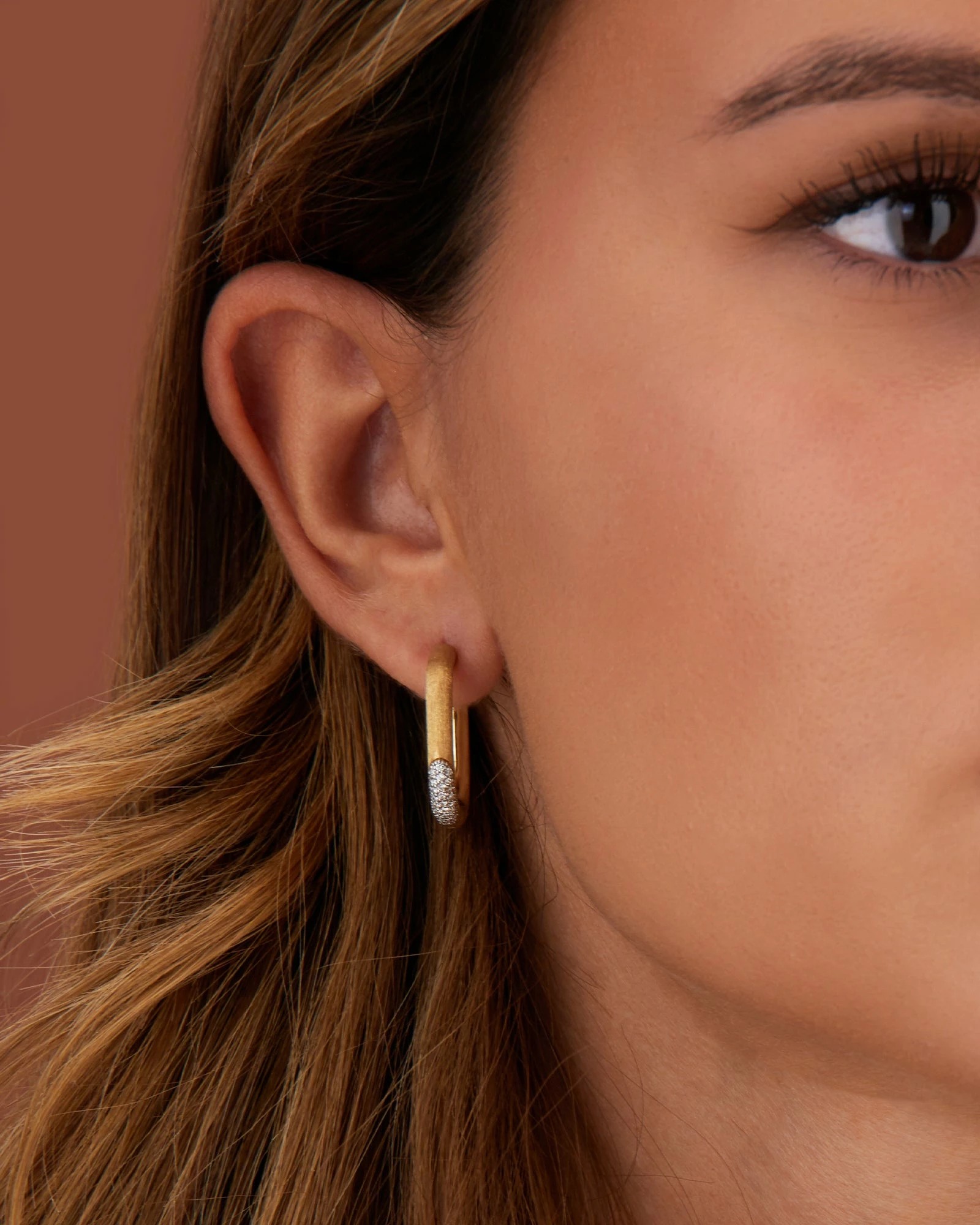 The shapes of the circle and of the square blend in this handmade 18kt gold hoop earrings, giving life to a delicate creation with rounded corners and embellished with an original diamonds pavé. A refined and contemporary jewel, perfect on every occasion. Laura’s advice? For a contemporary touch, wear this creation with the smallest version (OS5-602)!
