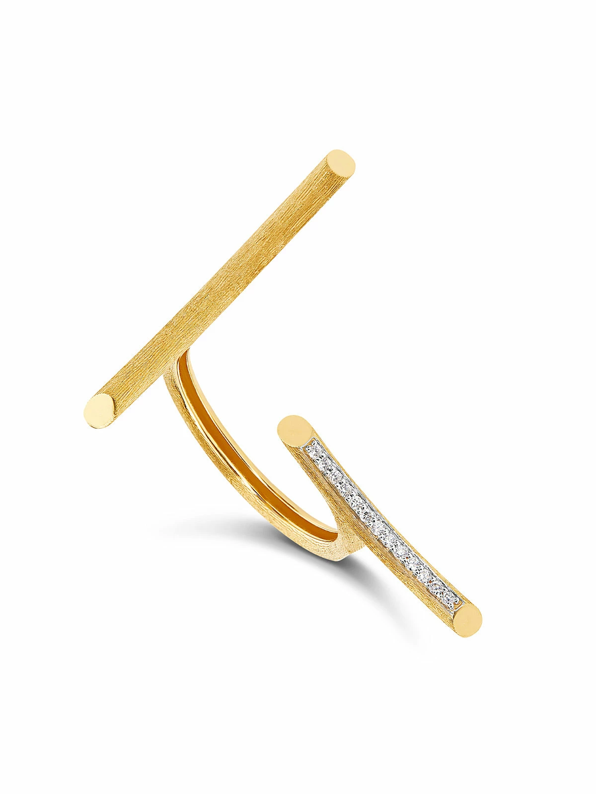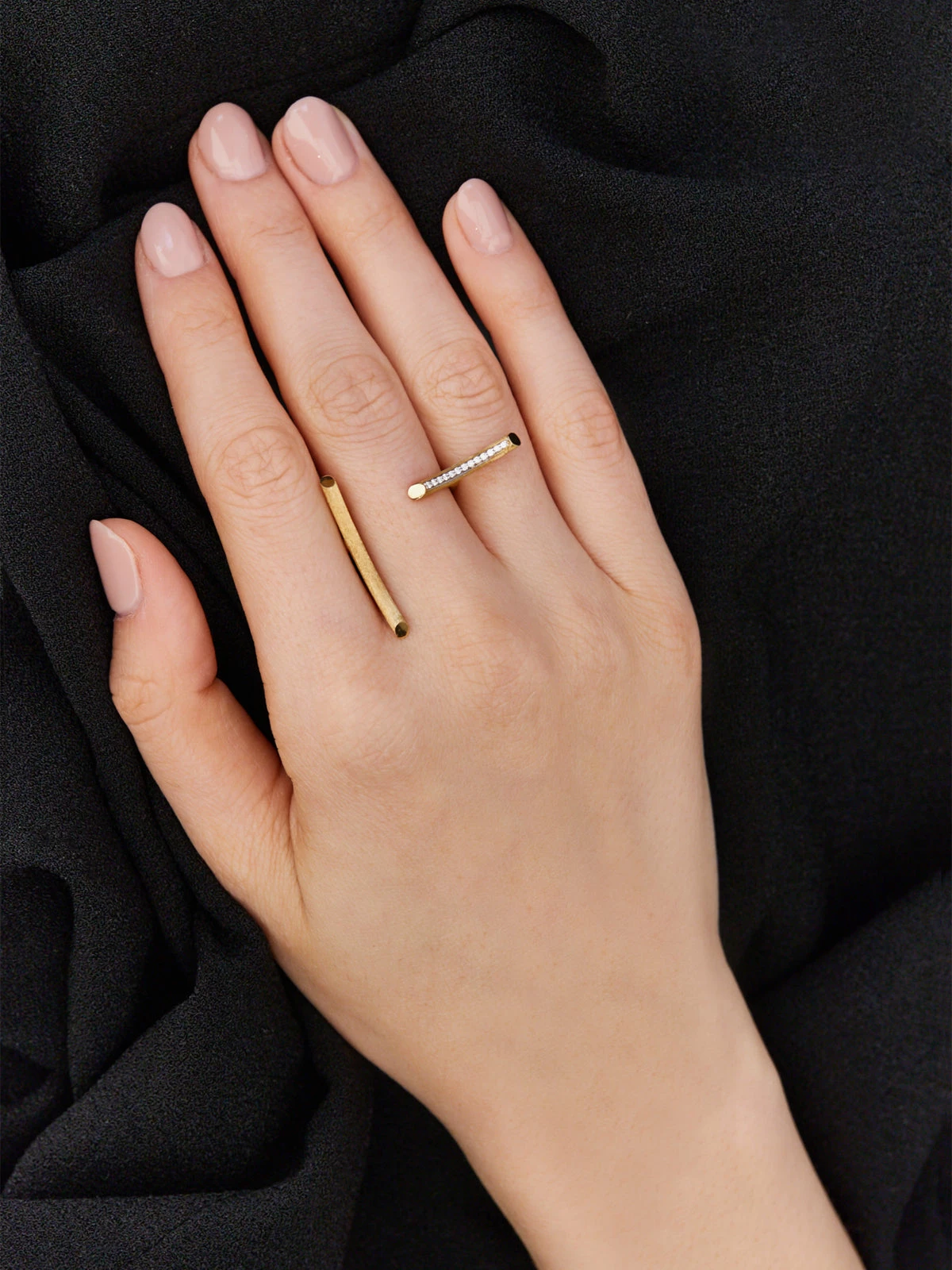 Freedom and creativity characterize this ring in 18kt gold and diamonds with a unique design, whose geometry escapes any classic canon. A jewel that seems to float between the fingers, marrying and emphasizing their movements and gestures.