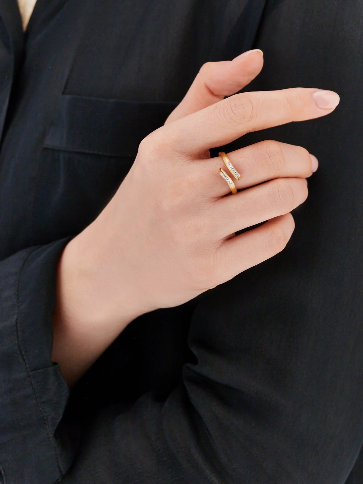 A ring in 18kt gold and diamonds with a sinuous and free movement, which escapes the classic canons, giving life to a jewel with a powerful personality.