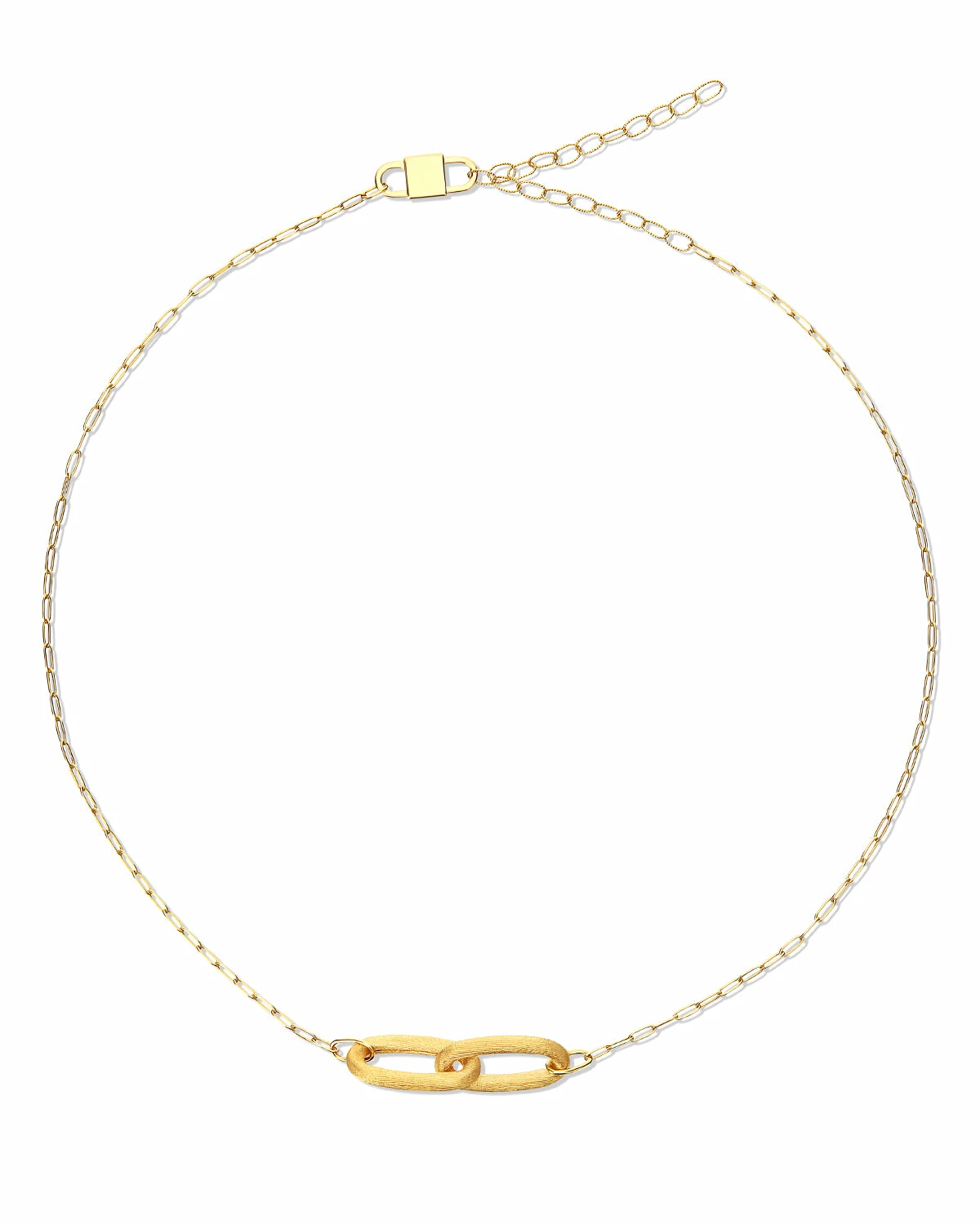 Two rings in 18kt gold find each other on this minimal chain, giving life to an essential and embracing necklace, entirely hand engraved. A jewel that makes you fall in love with its purity and elegance.