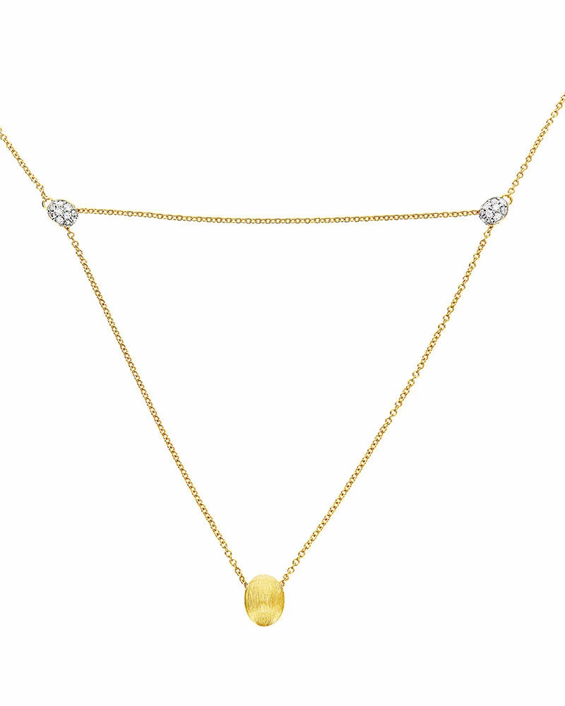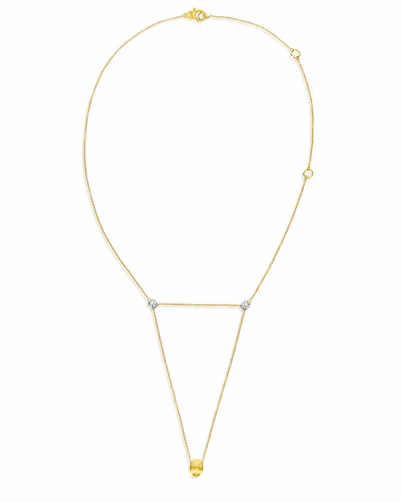 LUCE is our interpretation of the classic diamond pendant: a sparkling triangle with 2 boules in diamonds and one in 18kt gold at its vertices, and in which the delicate gold chain that unites them, once placed on the skin, seems to almost disappear letting only the boules shine. This is why our designer Laura likes to define this necklace a “tattoo”. A masterpiece of craftsmanship ready to gracefully decorate your skin, but which unlike a real tattoo changes and is expressed in different versions depending on your look or on the occasions, with just a simple move!Three gold small rings make this necklace extremely versatile and open to the most diverse interpretations, from a softer one to a sensual chocker.