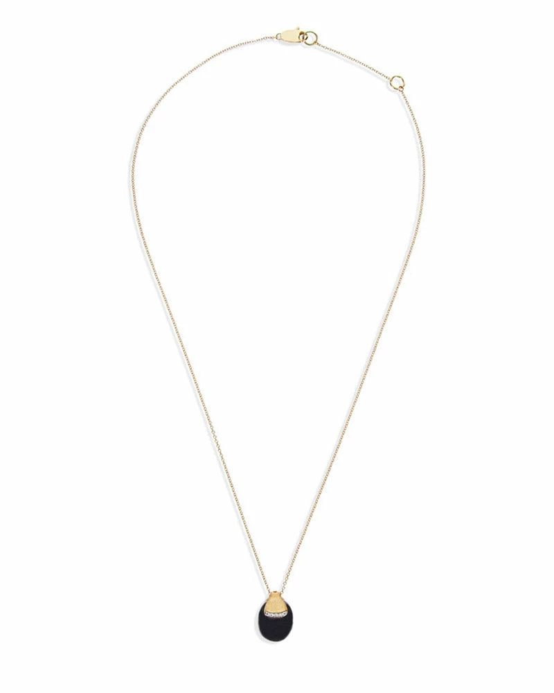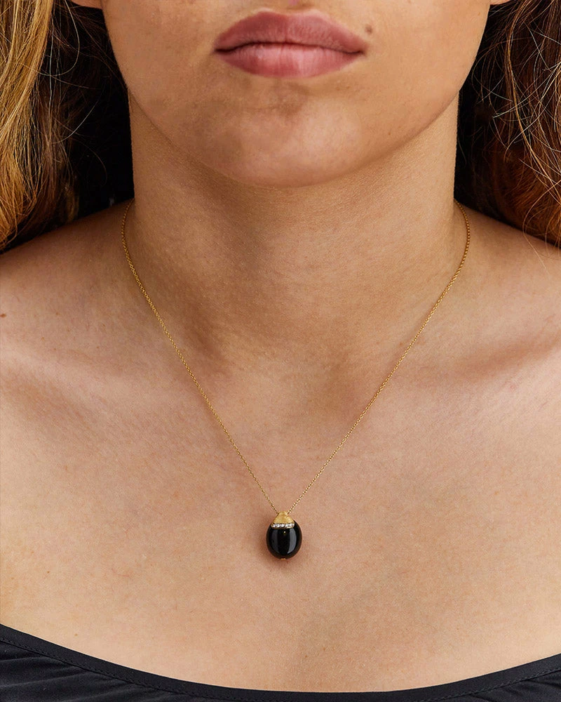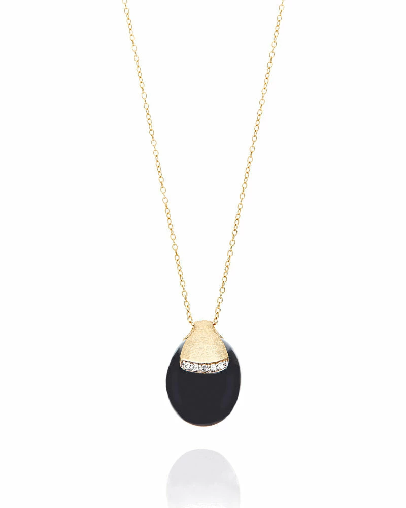 A refined 18kt gold and black onyx pendant crowned with an elegant diamonds detail. The sophisticated gold workmanship plays with light, reflecting it suggestively, and embraces the precious stone like a shell, sealing the encounter between Nature and craftsmanship.