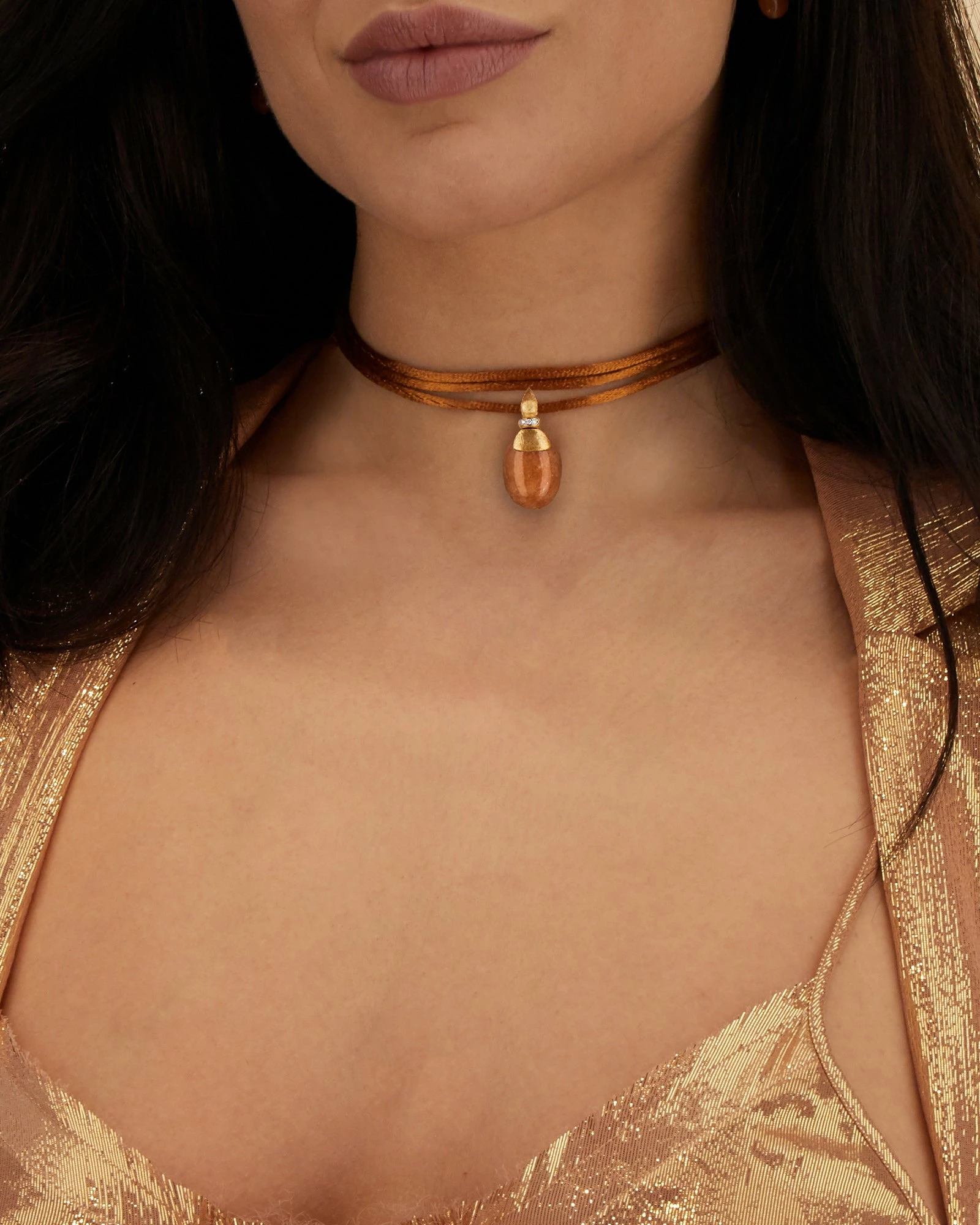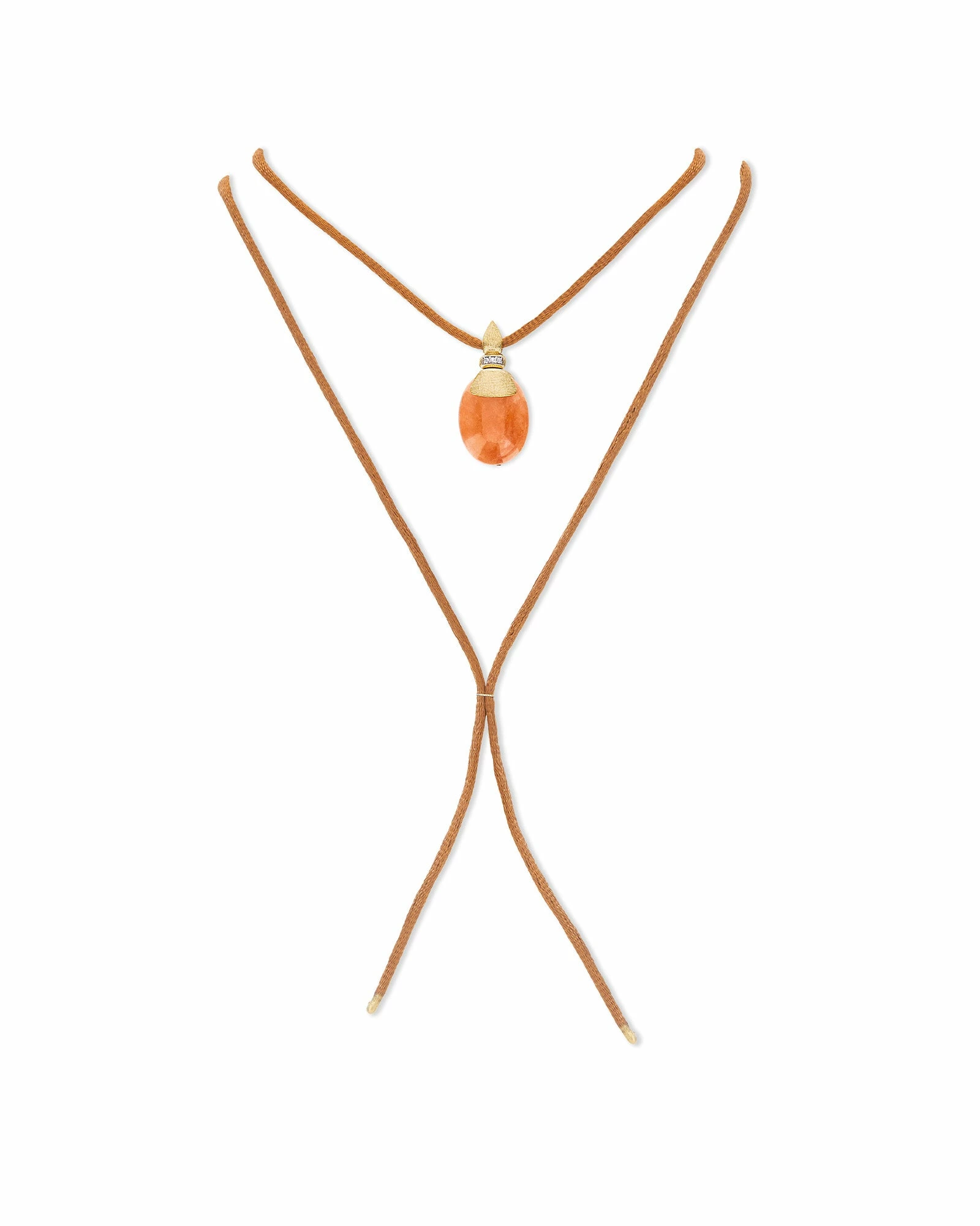 Refined pendant in orange aventurine, 18kt gold and diamonds. A necklace inspired by Petra, the magnificent archaeological site in the southwestern Desert of Jordan and declared a UNESCO World Heritage Site. Interpret this jewel as a bracelet or a necklace, transforming it into your faithful travel companion.