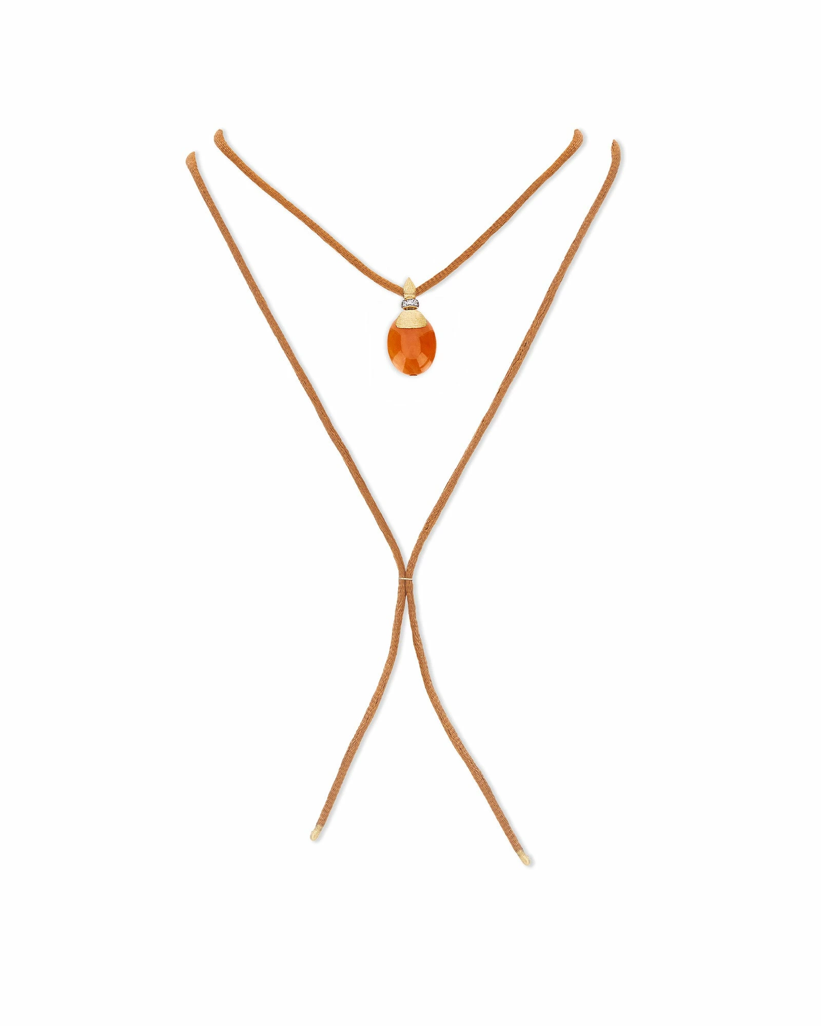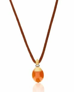 Refined pendant in orange aventurine, 18kt gold and diamonds. A necklace inspired by Petra, the magnificent archaeological site in the southwestern Desert of Jordan and declared a UNESCO World Heritage Site. Interpret this jewel as a bracelet or a necklace, transforming it into your faithful travel companion.