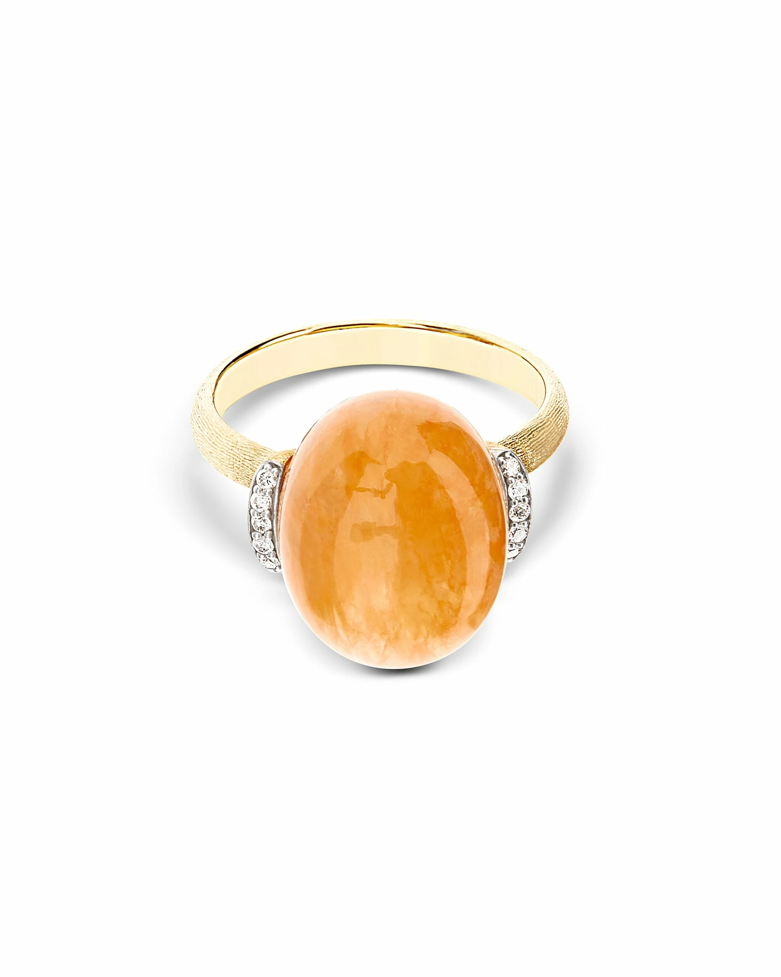 The fascinating orange aventurine meets the 18kt gold and diamonds in this ring from the Terre Lontane collection, inspired by Petra, the magnificent archaeological site located in the southwestern desert of Jordan. A jewel with a timeless charm, conceived as a precious talisman to always carry with you.