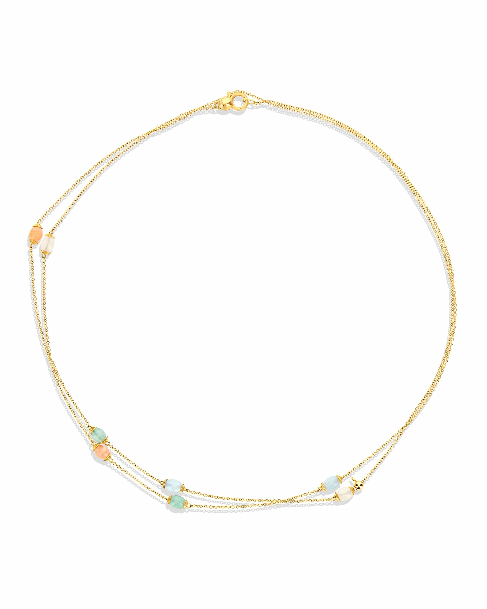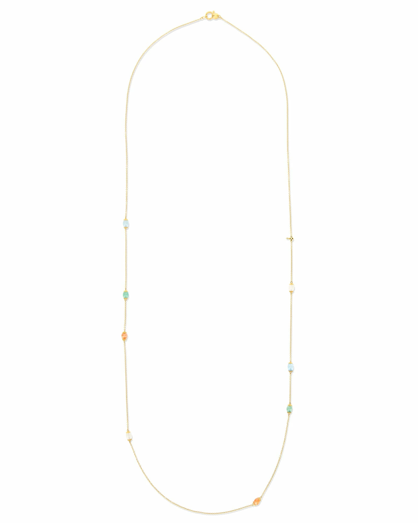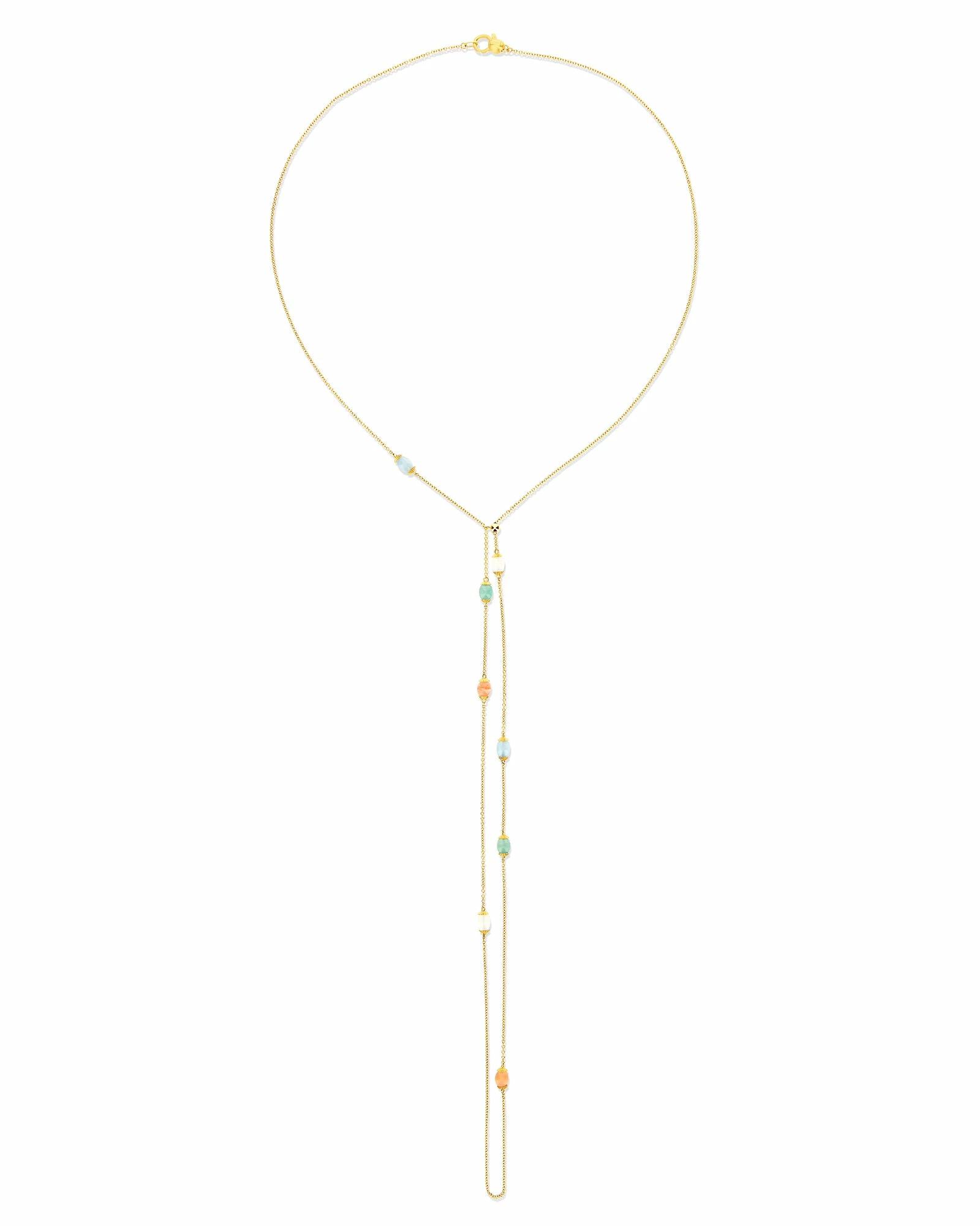 From our gypsyΒ Terre Lontane collection, a delicate 18kt gold chanel decorated with orange aventurine, green aventurine, milky aquamarine and moonstone boules. The small gold hook allows you to wear the jewel in a lariat style, thus giving it a new interpretation. The necklace can be worn alone or customized with the magnificent pendants of the collection.