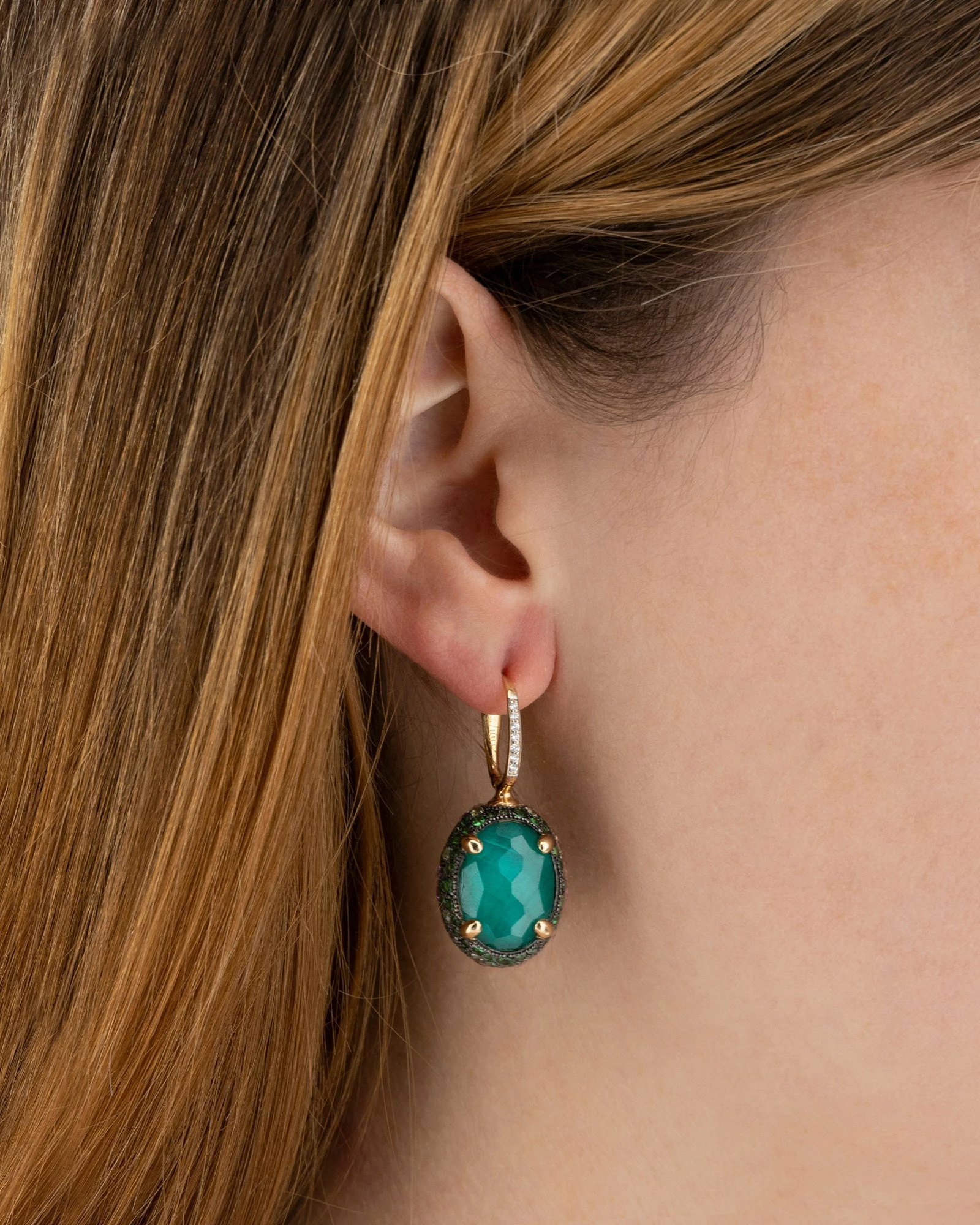 “Ciliegine Reverse” (literally “Reverse cherries”) were born from the encounter between two of the most iconic Nanis jewels. Very high manufacturing, creativity and genius come together in these earrings that reveal their double with a simple gesture. A signature piece in 18kt gold that alternates a central doublette with green Labradorite and Rock Crystal with a pavé of pink sapphires, amethysts, green sapphires and tsavorites. Let yourself be seduced by this luxurious play of light!