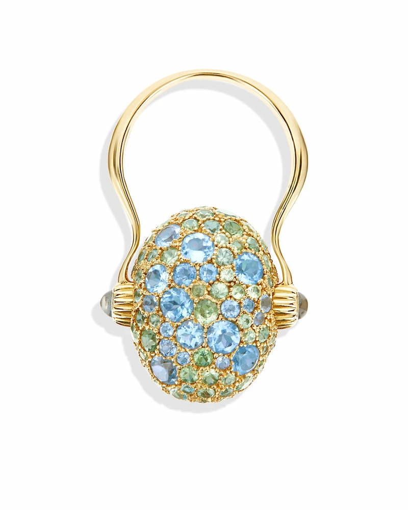 With REVERSE rings, luxury marries the dynamism of creativity, of invention, of surprise: with a simple rotation, in fact, this 18 kt gold ring will show you its precious double! REVERSE alternates a doublette with Mother of pearl and LONDON Blue Topaz and pavè of Blue Diamonds, Green Sapphires and Swiss Blue Topaz. A sumptuous game of lights that will surprise you every time you’ll wear it.