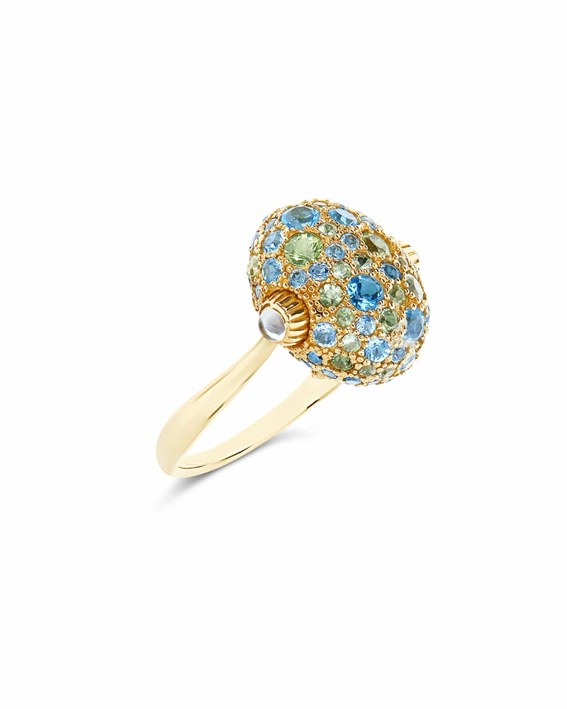 With REVERSE rings, luxury marries the dynamism of creativity, of invention, of surprise: with a simple rotation, in fact, this 18 kt gold ring will show you its precious double! REVERSE alternates a doublette with Mother of pearl and LONDON Blue Topaz and pavΓ¨ of Blue Diamonds, Green Sapphires and Swiss Blue Topaz. A sumptuous game of lights that will surprise you every time you’ll wear it.