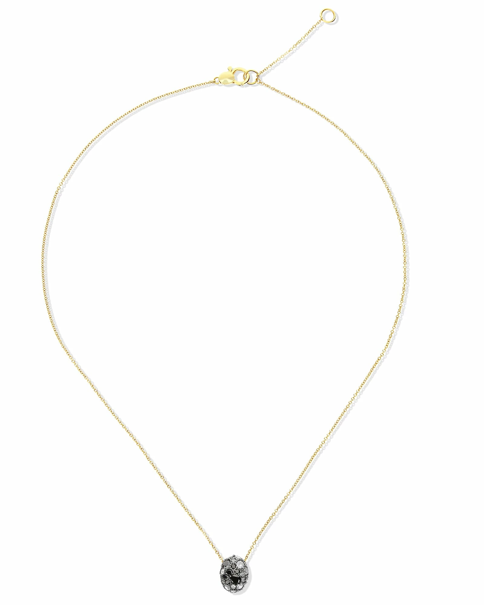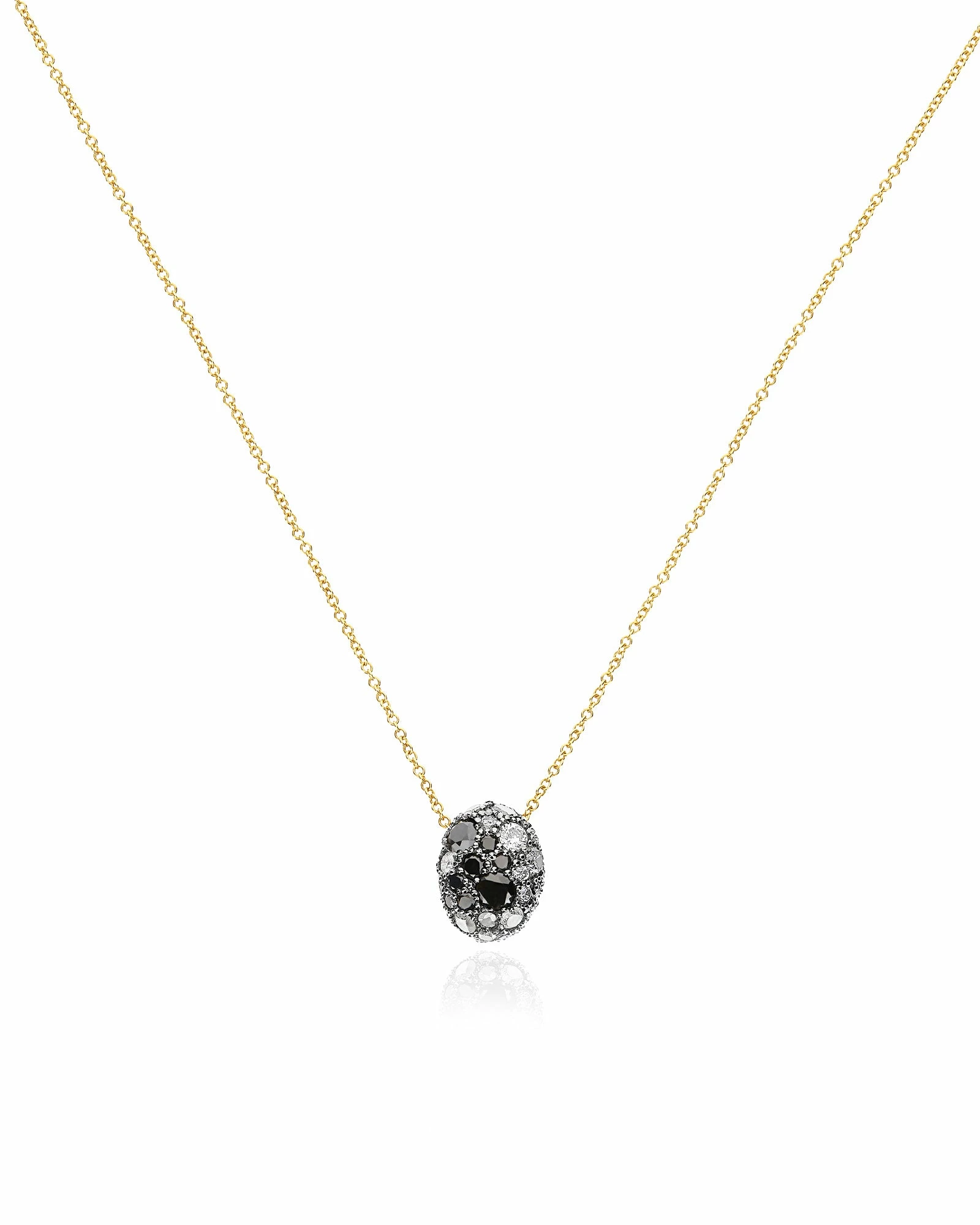 Let yourself be inspired by this elegant and refined double face pendant of the Reverse Collection. A 18kt gold and diamonds necklace, enriched by beautiful and colorful natural stones, entirely handmade as all the Nanis jewels. A true masterpiece in 18kt gold that alternates a fascinating ruby with an extraordinary pavè of grey, black and ice diamonds.
