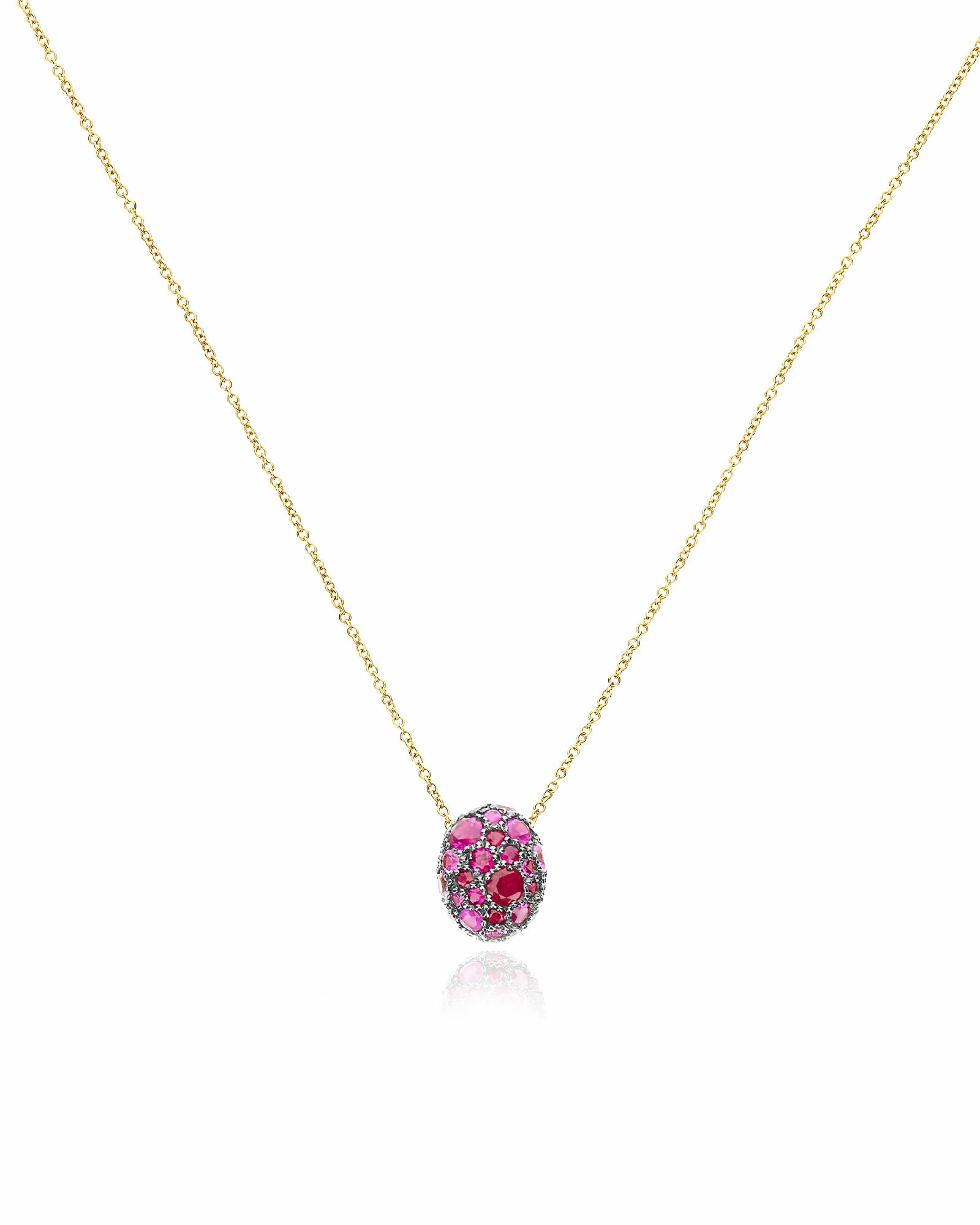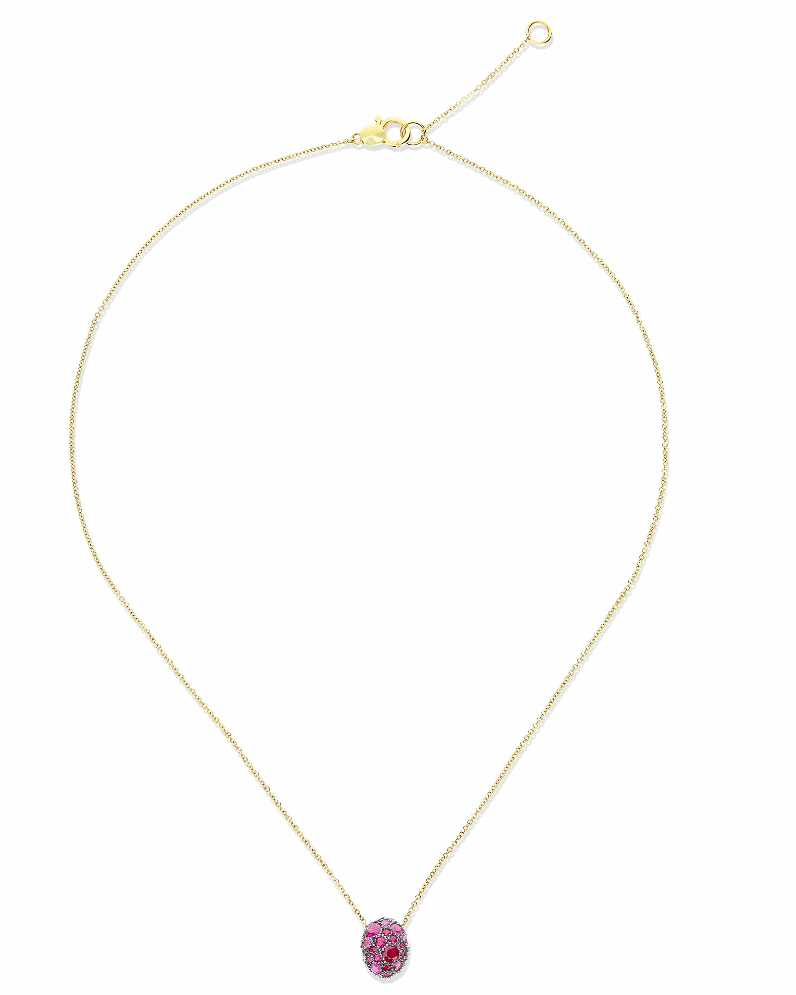 A 18kt gold and diamonds necklace, enriched by beautiful and colorful natural stones, entirely handmade as all the Nanis jewels. A true masterpiece in 18kt gold that alternates a central doublette in white opal and diamonds, with an extraordinary pavè of pink and fuchsia sapphires and ruby. Let yourself be seduced by this elegant and refined double face pendant of the Reverse Collection.Â