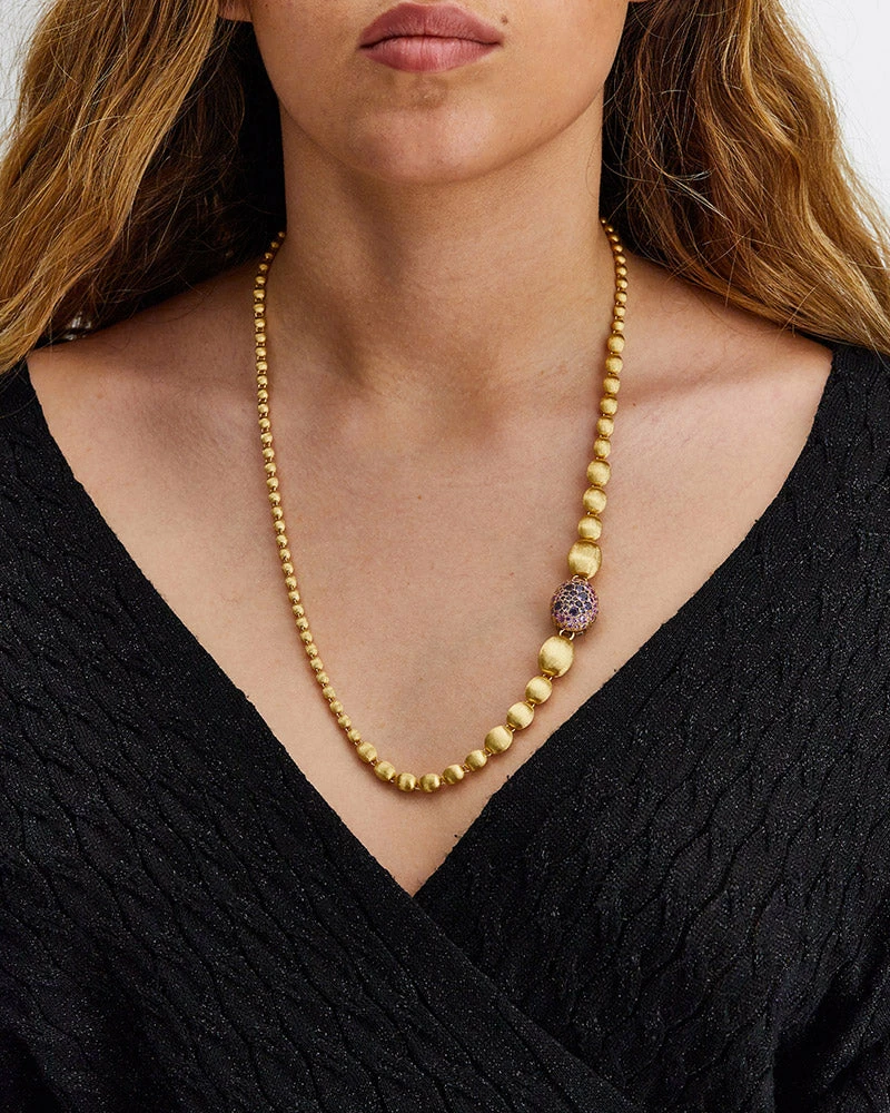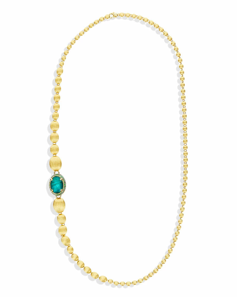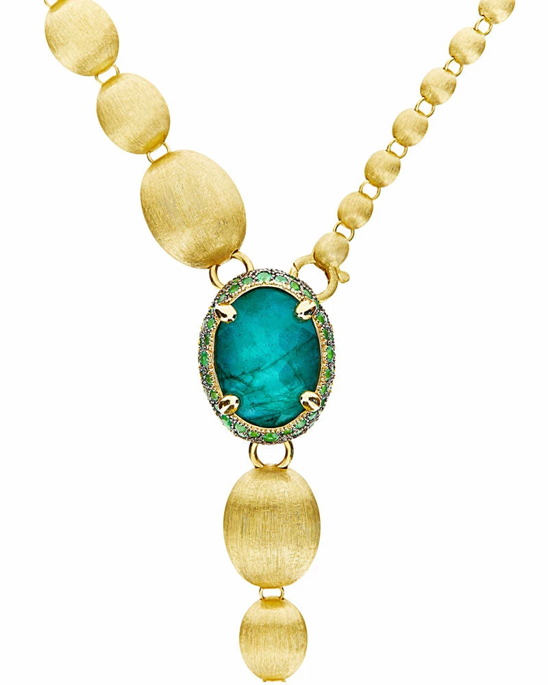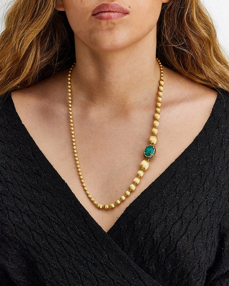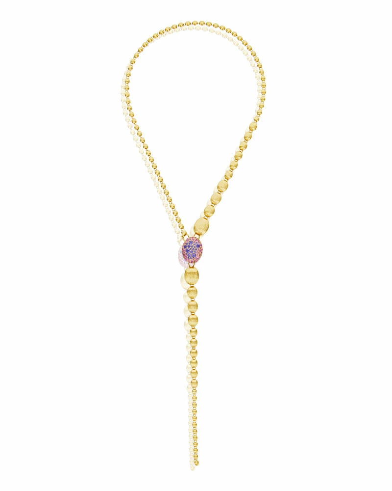 An ode to the elegance of colors and to the versatility, this gold and precious stones necklace is one of Nanis’ signature pieces. The double-faced pendant is designed to sublimate the most diverse looks, finely fastened to a row of “unusal pearls”, all of them hand-engraved, which can also be detached and combined to the necklace for a longer version.A contemporary must have suitable for any occasion not only for its style but also for its surprising lightness.