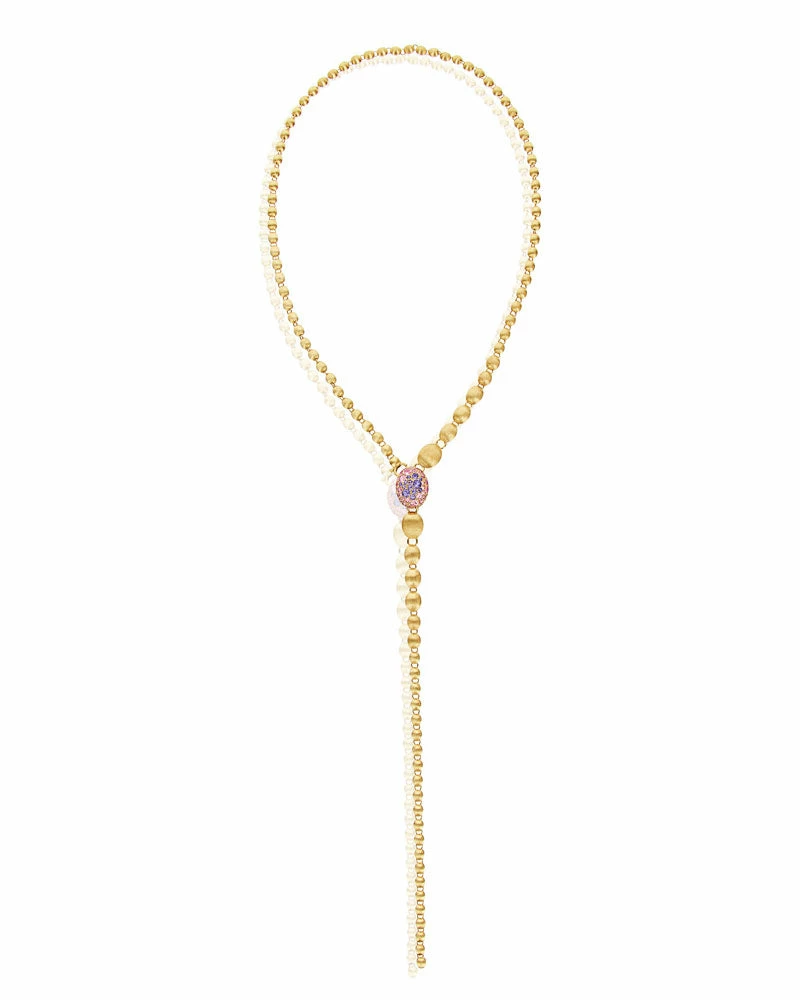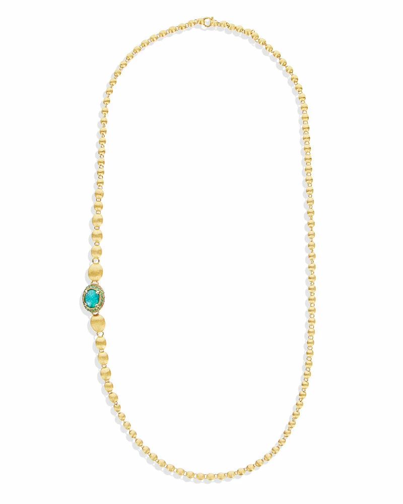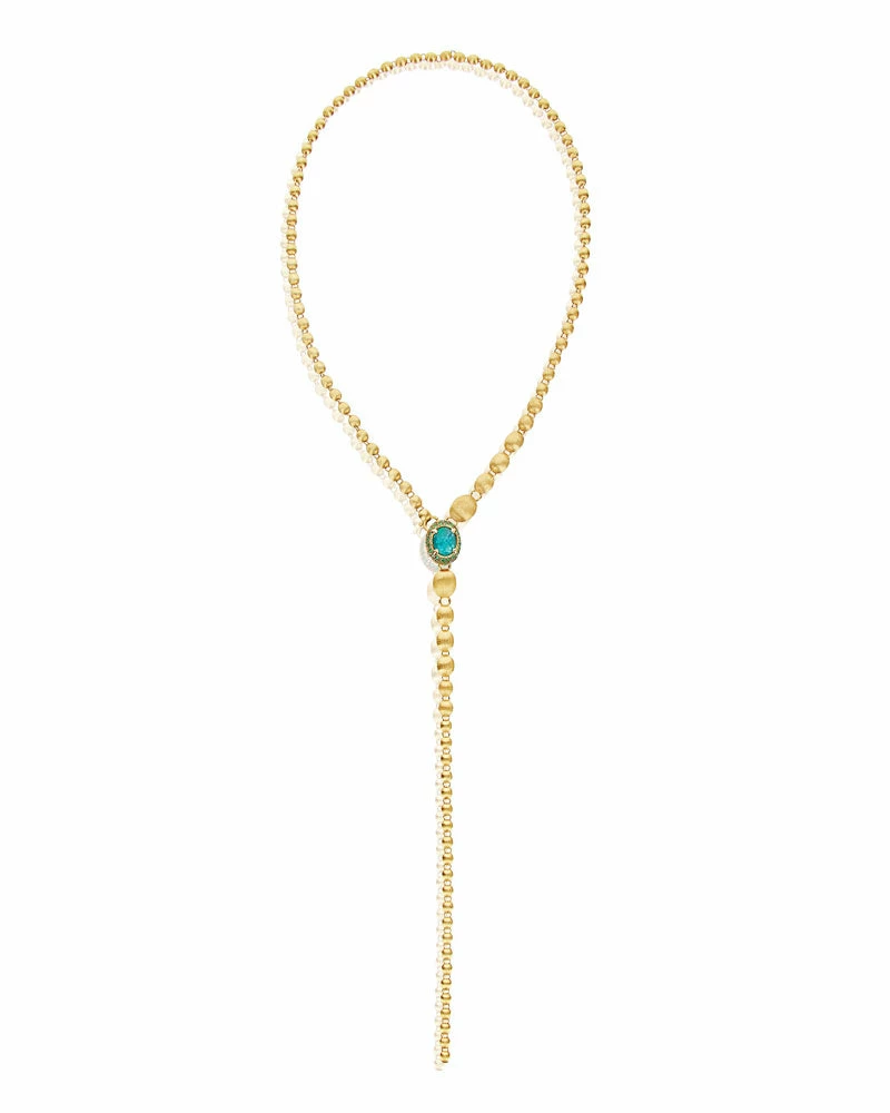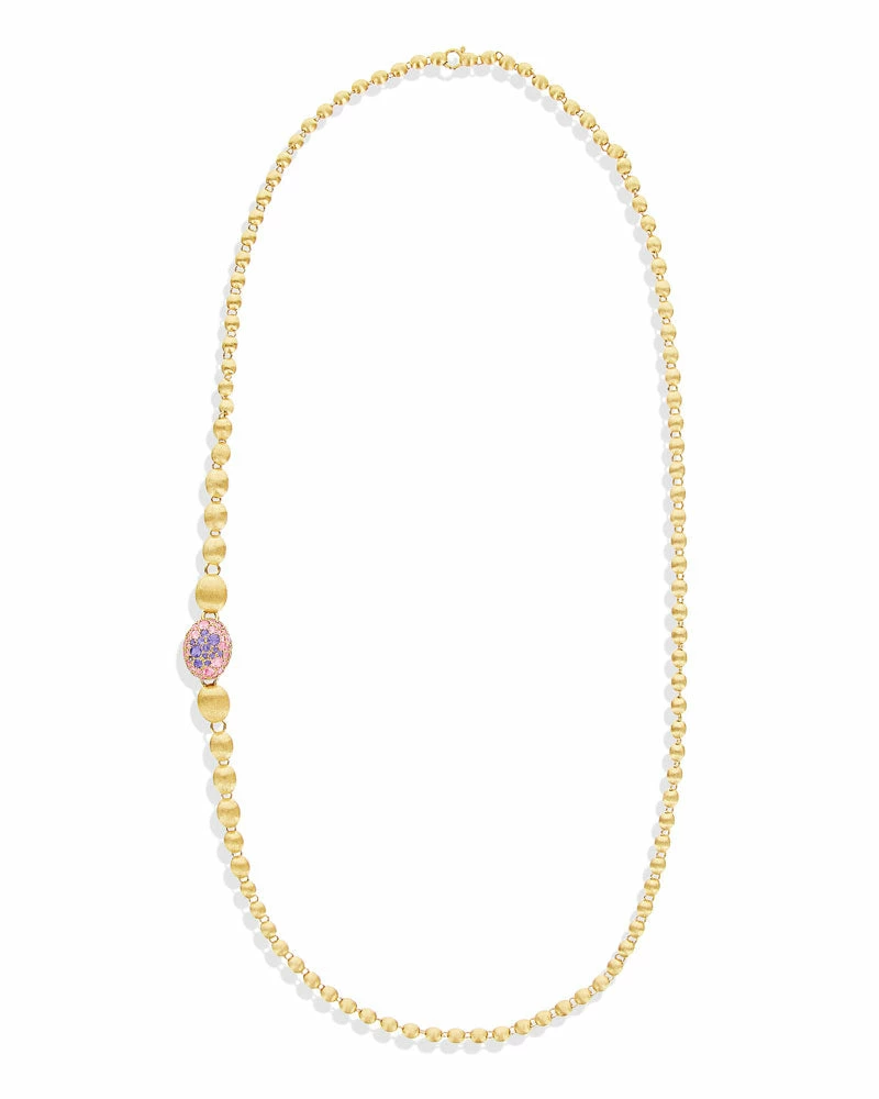 An ode to the elegance of colors and to the versatility, this 18kt gold and natural stones necklace is one of Nanis’ signature pieces. The double-faced pendant is designed to sublimate the most diverse looks, finely fastened to a row of “unusal pearls”, all of them hand-engraved, which can also be detached and combined to the necklace for a longer version.A contemporary must have suitable for any occasion not only for its style but also for its surprising lightness.
