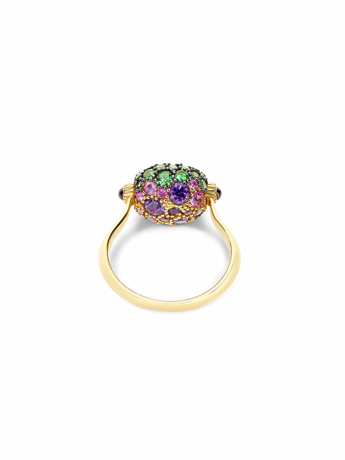 With REVERSE rings, luxury marries the dynamism of creativity, invention, surprise: with a simple rotation, in fact, this 18 kt gold ring will show its precious double! REVERSE alternates a central doublette with green Labradorite and Rocca Crystal with a pavè of pink sapphires, amethysts, green sapphires and tsavorites. A sumptuous play of lights that will surprise you every time you’ll wear it.